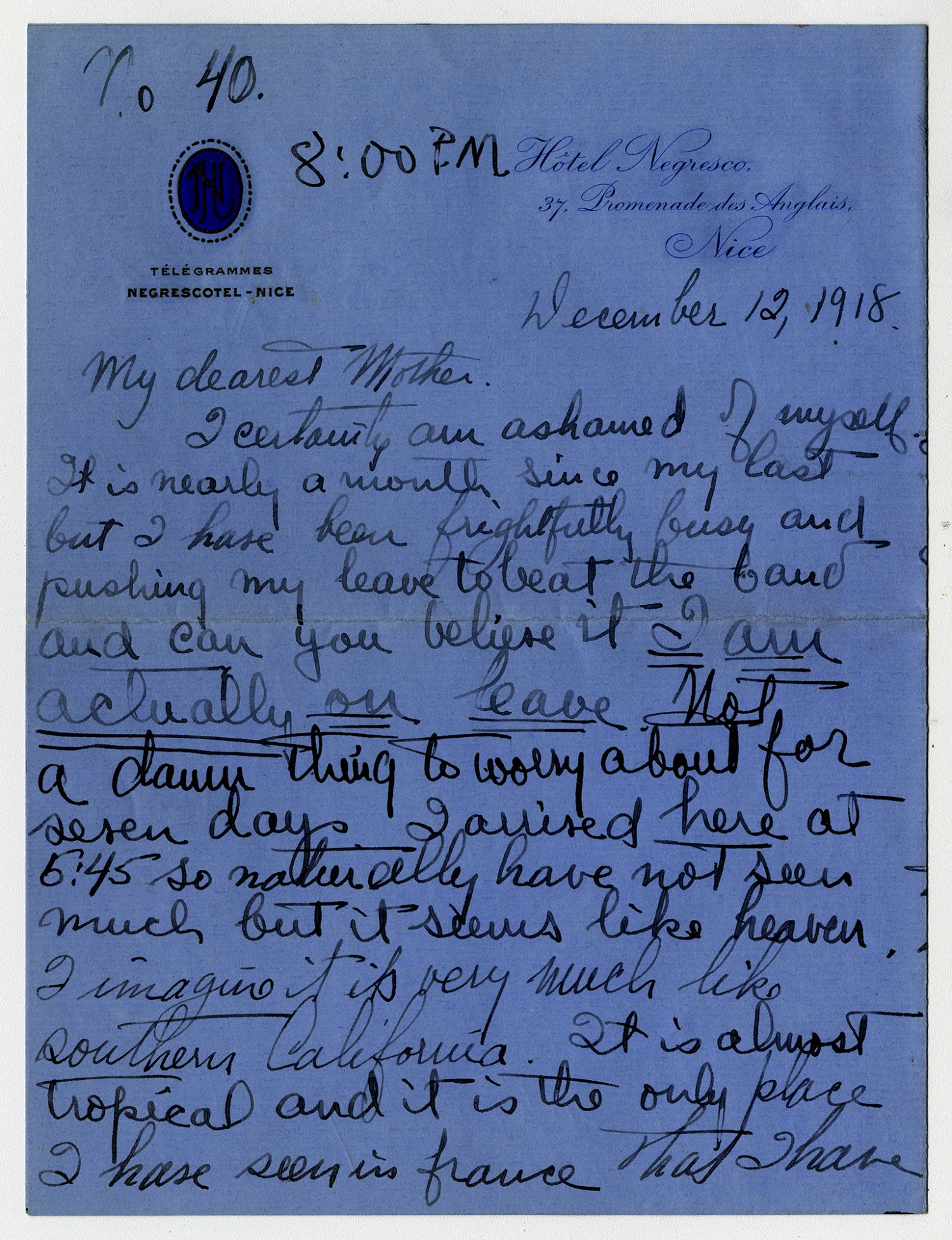 [Hotel Negresco letterhead] No 40. 8:00P.M. December 12, 1918 My dearest Mother. I certainly am ashamed of myself. It is nearly a month since my last but I have been frightfully busy and pushing my leave to beat the band and can you believe it I am actually on leave. Not a damn thing to worry about for seven days. I arrived here at 5:45 so naturally have not seen much but it seems like heaven. I imagine it is very much like southern California, It is almost tropical and it is the only place I have seen in France that I have