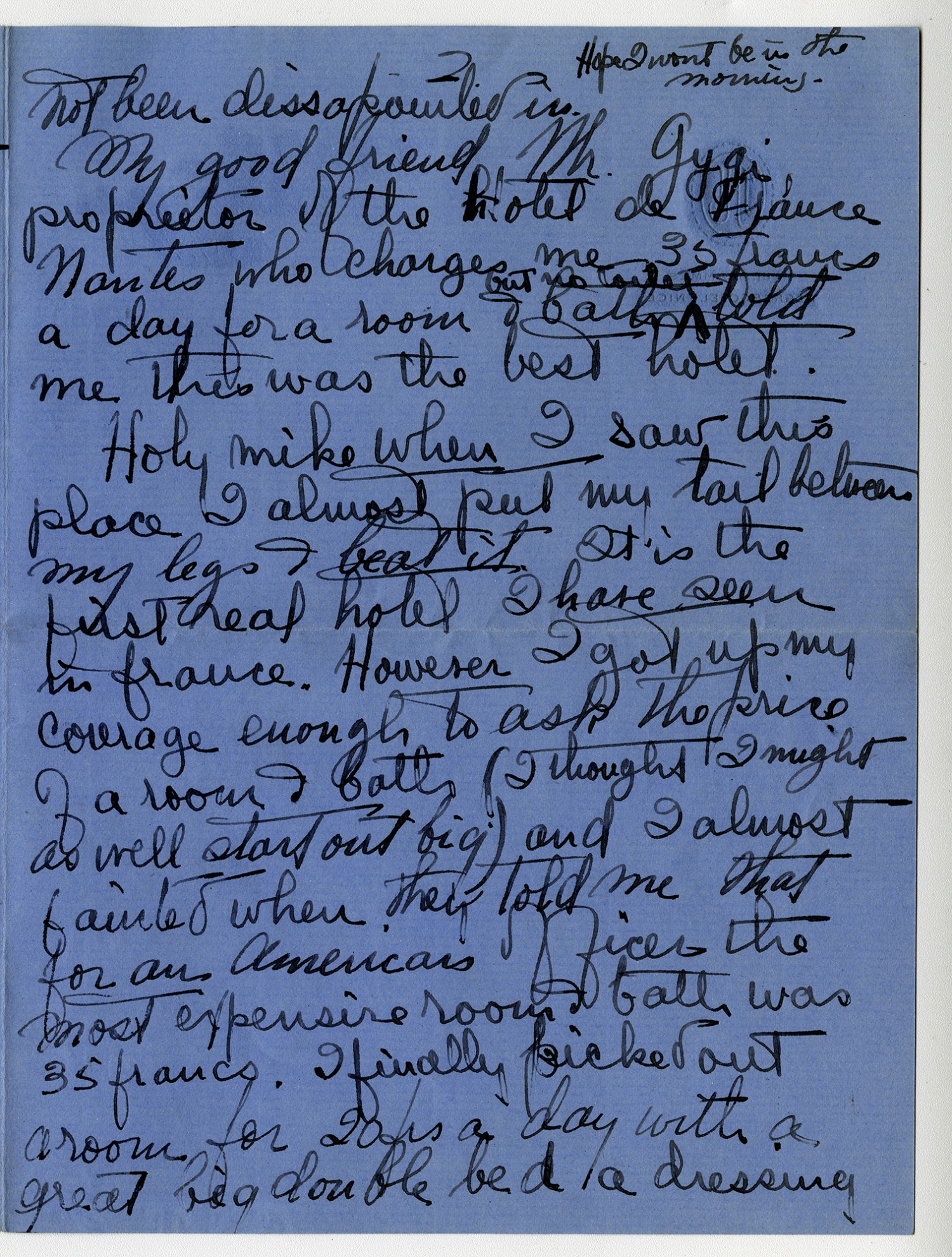 not been disappointed in. Hope I wont be in the morning. Mt good friend Mr. Gygi proprietor of the hotel de France Nantes who charges me 35 francs a day for a room & bath but no toilet told me this was the best hotel. Holy Mike when I saw this place I almost put my tail between my legs and beat it. It is the first real hotel I have seen in France. However I got up my courage enough to ask the price of a room & bath (I thought I might as well start out big) and I almost fainted when they told me that for American Officers the most expensive room & bath was 35 francs. I finally picked out a room for 20 frs a day with a great big double bed a dressing