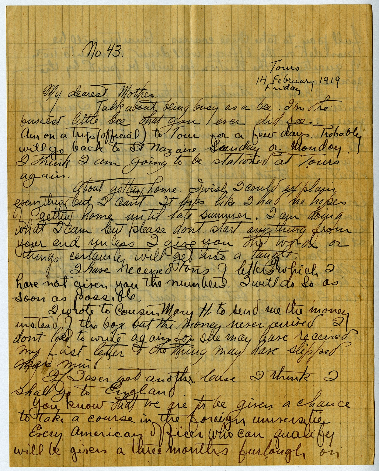 No 43. Tours 14 February 1919 Friday My dearest Mother. Talk about being busy as a bee. I