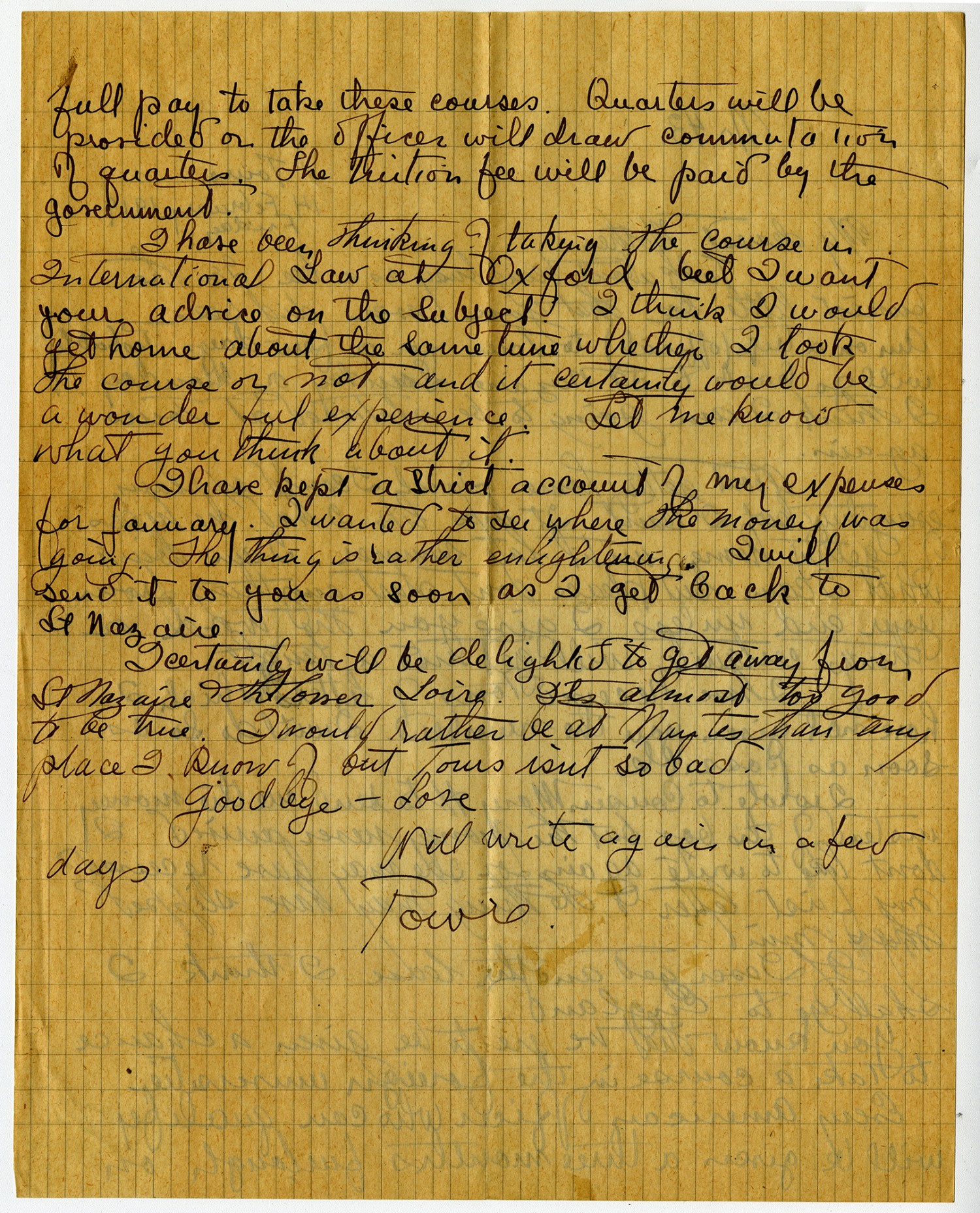 full pay to take these courses. Quarters will be provided or the officer will draw commutation of quarters. The tuition fee will be paid by the government. I have been thinking of taking the course in International Law at Oxford but I want your advice on the subject. I think I would get home about the same time whether I took the course or not and it certainly would be a wonderful experience. Let me know what you think about it. I have kept a strict account of my expenses for January. I wanted to see where the money was going. The thing is rather enlightening. I will send it to you as soon as I get back to St. Nazaire. I certainly will be delighted to get away from St. Nazaire the lower Loire. Its almost too good to be true. I would rather be at Nantes than any place I know but Tours isn