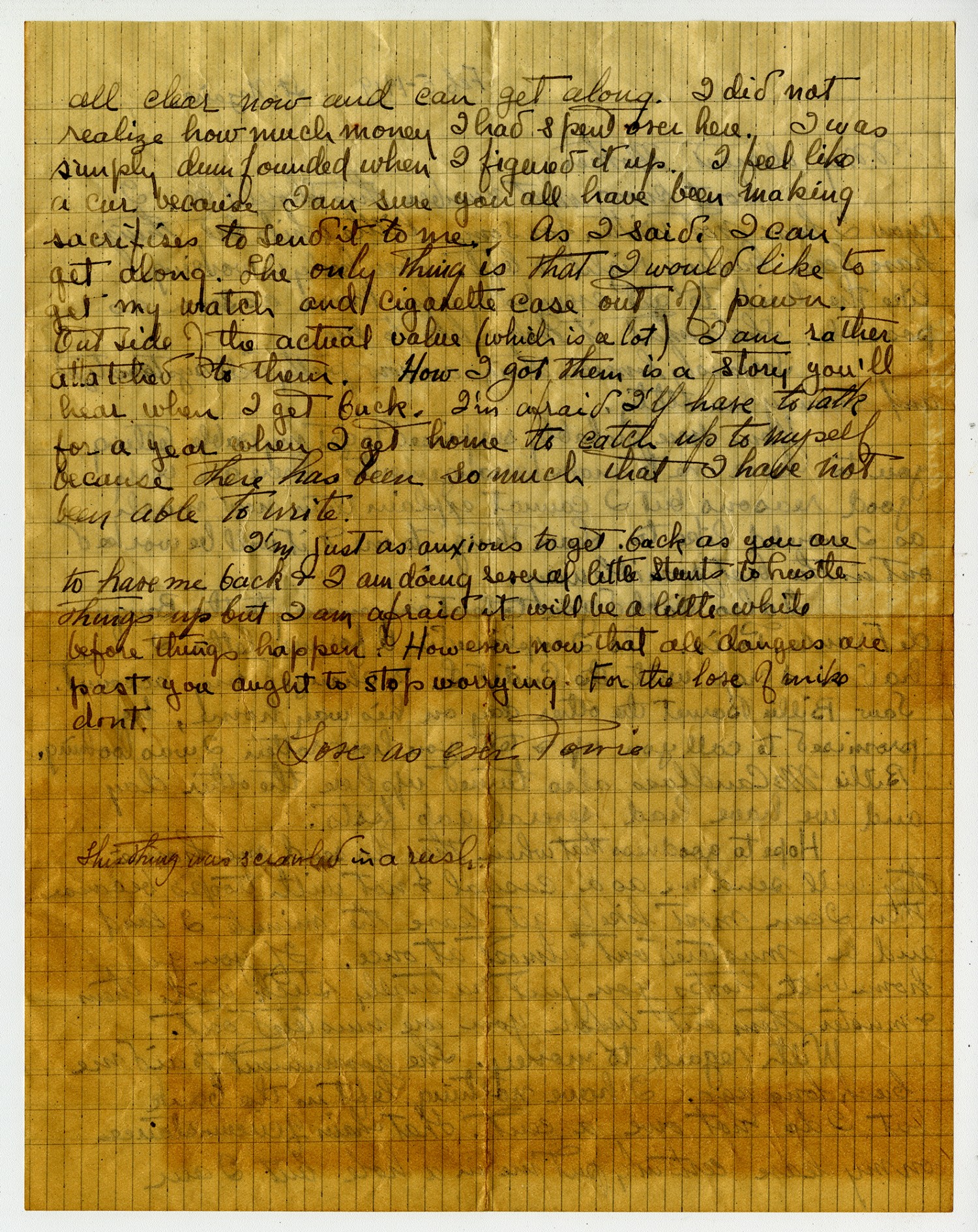 all clear now and can get along. I did not realize how much money I had spent over here. I was simply dumfounded when I figured it up. I feel like a cur because I am sure you all have been making sacrifices to send it to me. As I said, I can get along. The only thing is that I would like to get my watch and cigarette case out of pawn. Outside of the actual value (which is a lot) I am rather attached to them. How I got them is a story you