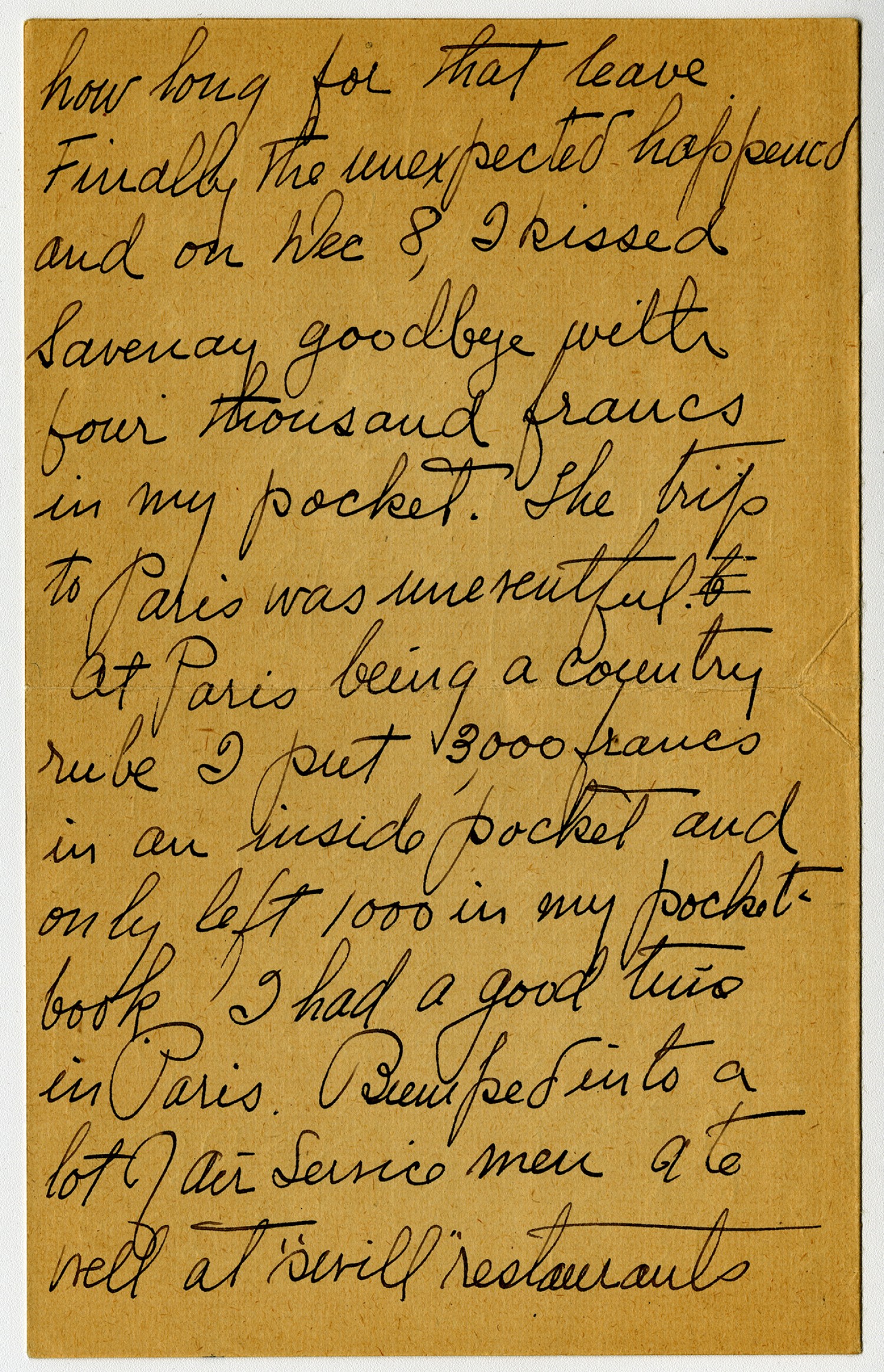 how long for that leave. Finally the unexpected happened and on [December] 8, I kissed Savenay goodbye with four thousand francs in my pocket. The trip to Paris was uneventful. At Paris being a country rube I put 3000 francs in an inside pocket and only left 1000 in my pocket book. I had a good time in Paris. Bumped into a lot of Air Service men ate well at