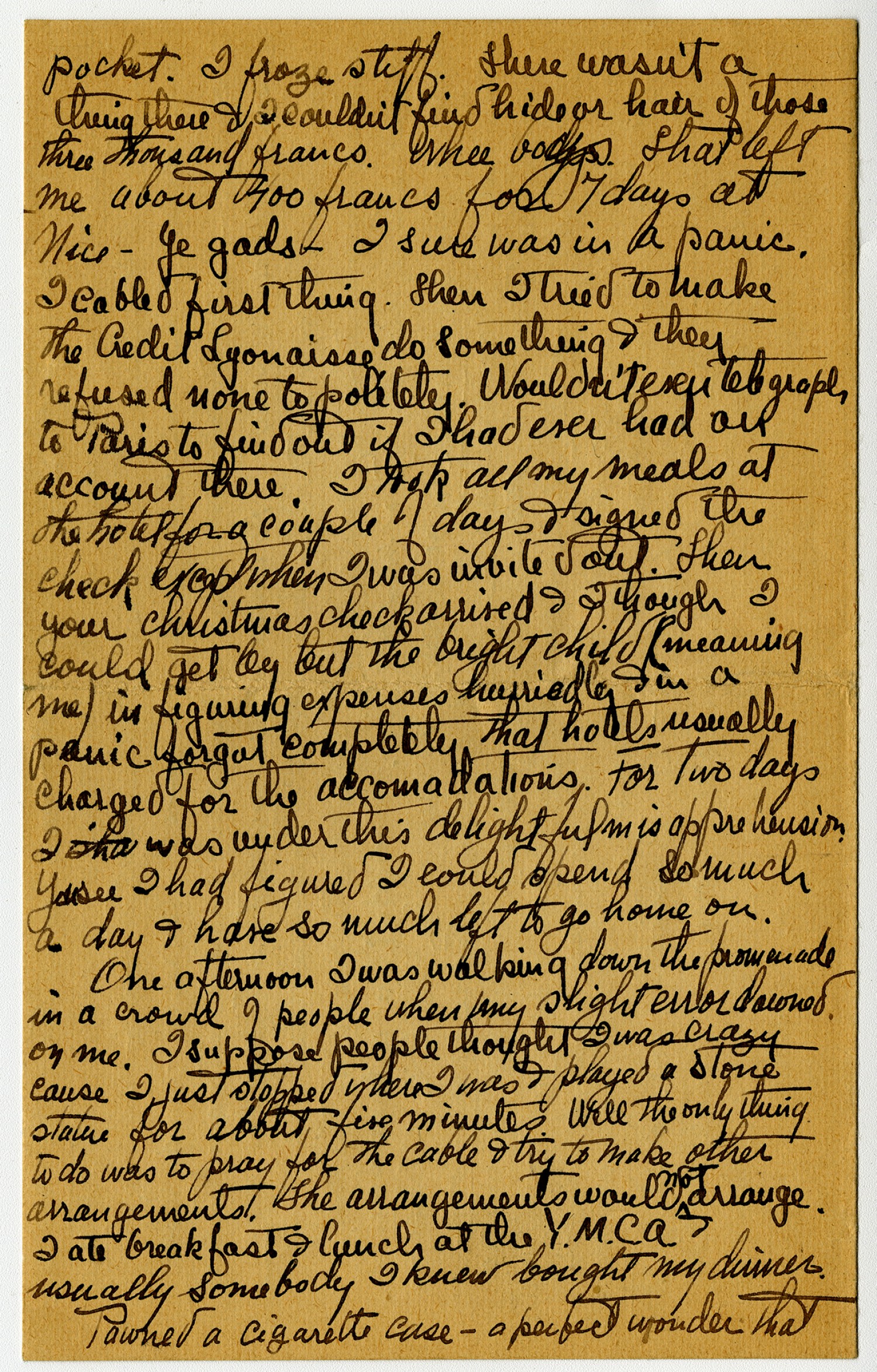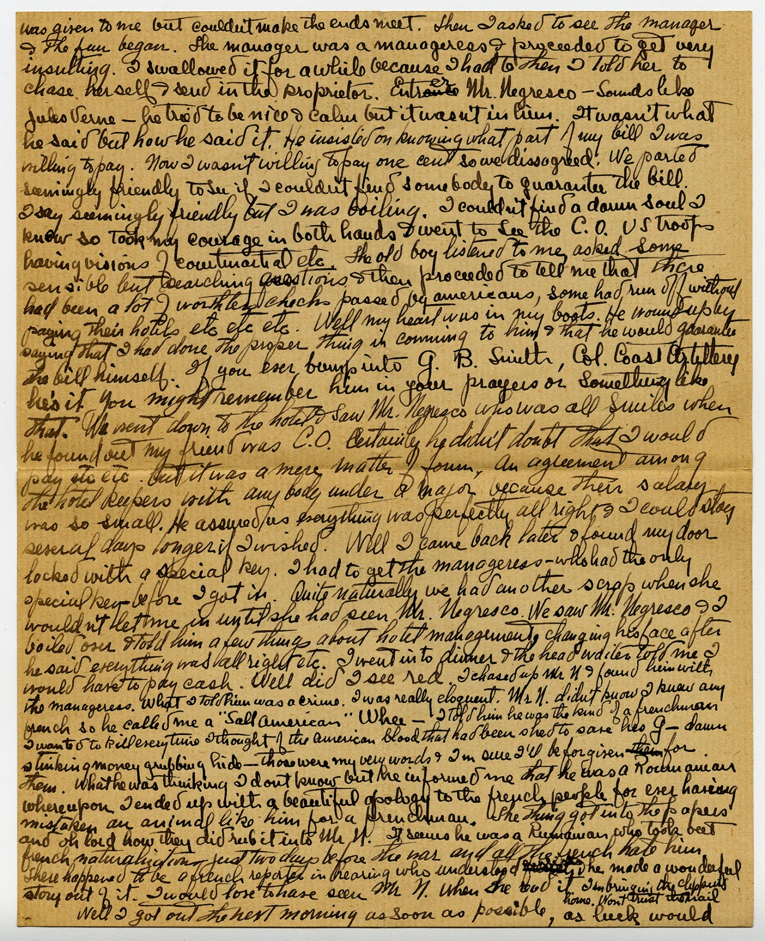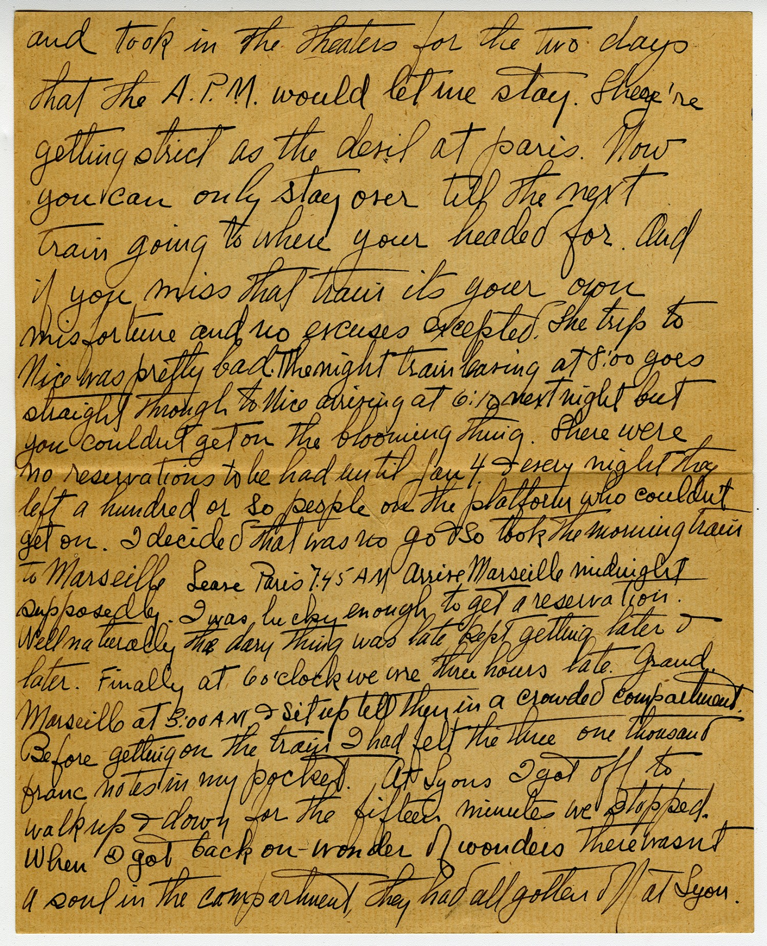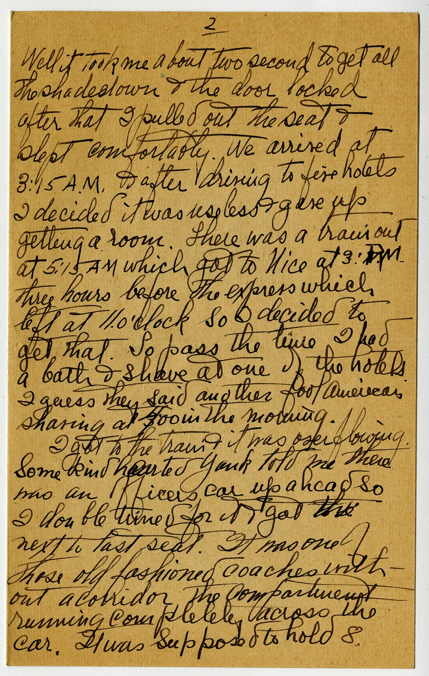 [page 4] Well it took me about two second to get all the shade down & the door locked after that I pulled out the seat & slept comfortably. We arrived at 3:15 AM & after driving to five hotels I decided it was useless & gave up getting a room. There was a train out at 5:15 AM which got to Nice at 3: PM three hours before the express which left at 11. o
