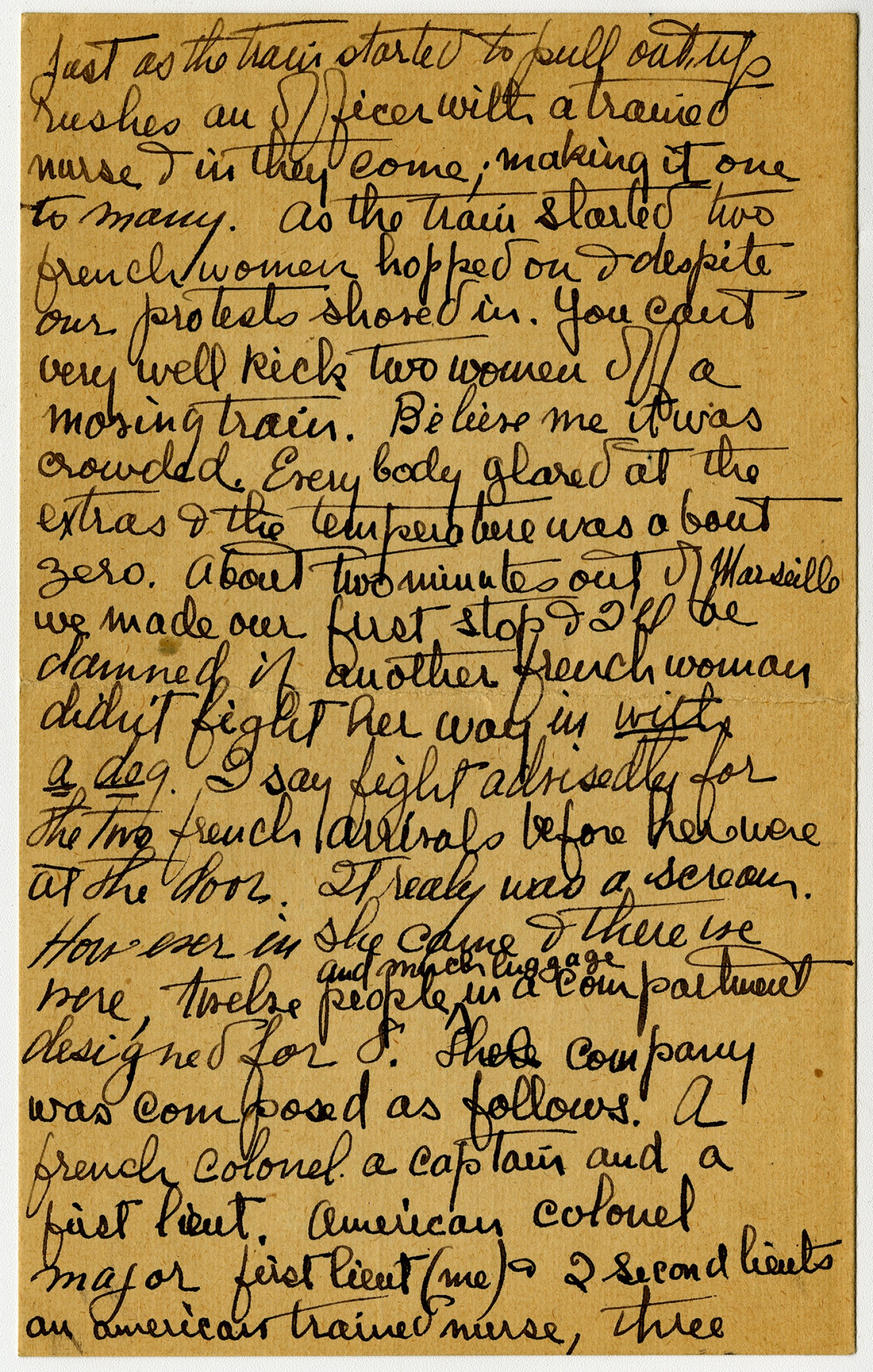 Just as the train started to pull out up rushes an officer with a trained nurse & in they come; making it one to many. As the train started two French women hopped on & despite our protest shoved in. You cant very well kick two women off a moving train. Believe me it was crowded. Everybody glared at the extras & the temperature was about zero. About two minutes out of Marseille we made our first stop & I