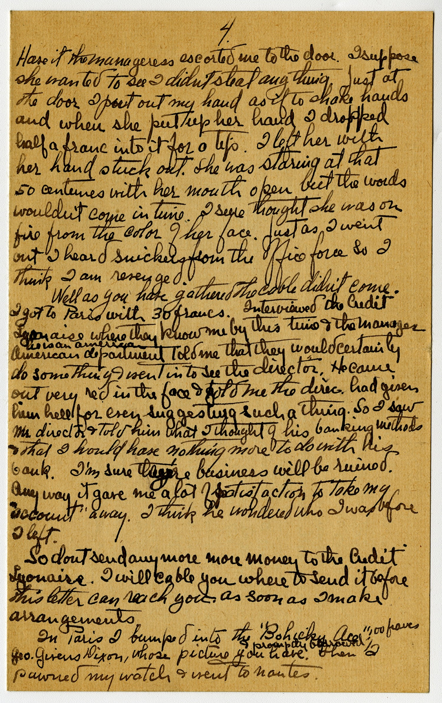 [page 4] have it the manageress escorted me to the door. I suppose she wanted to see I didn