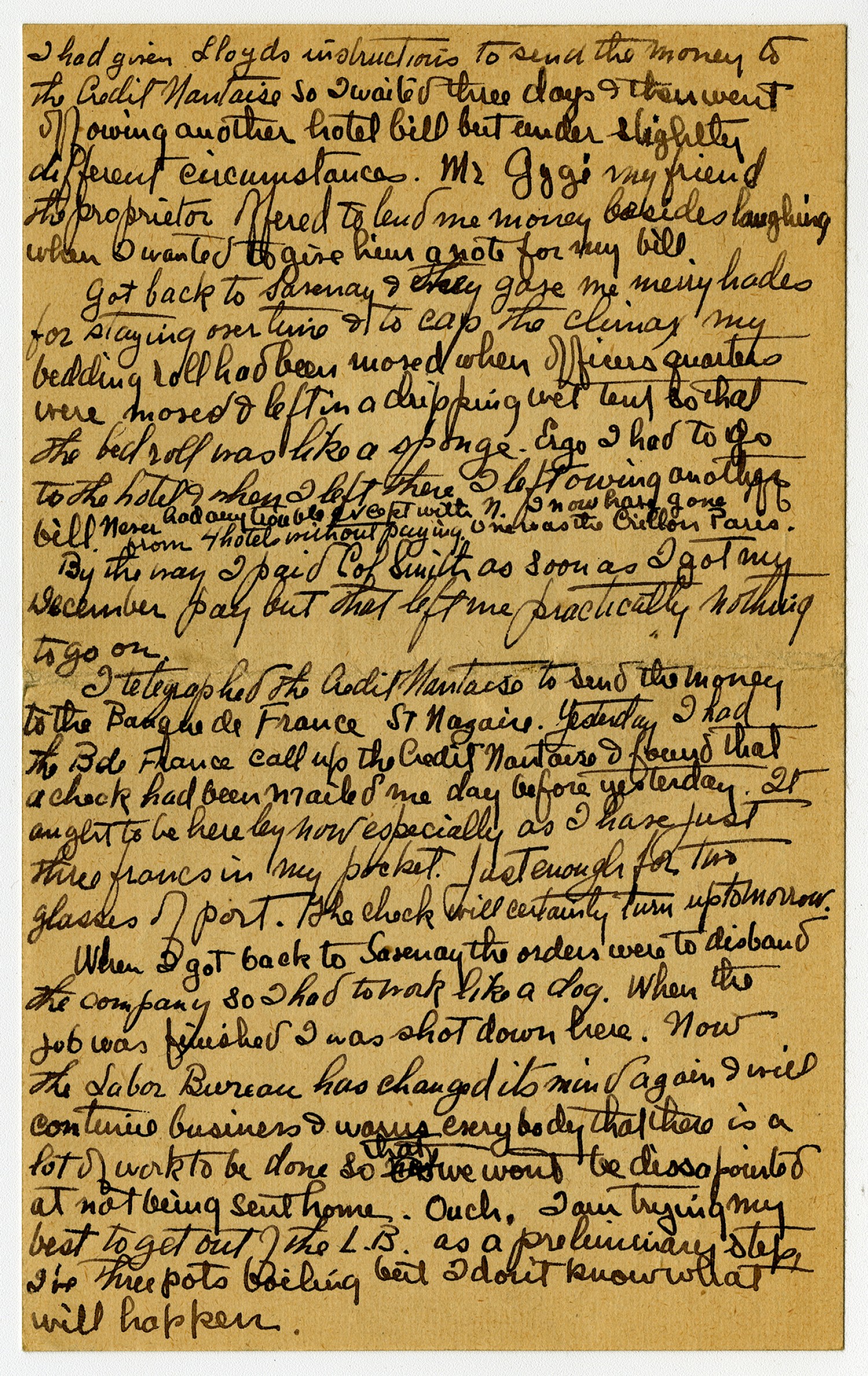 I had given Lloyds instructions to send the money to the Credit Nantaise so I waited three days & then went off owing another hotel bill but under slightly different circumstances. Mr Gygi my friend the proprietor offered to lend me money besides laughing when I wanted to give him a note for my bill. Got back to Savenay & they gave me merry hades for staying over time & to cap the climax my bedding roll had been moved when officers quarters were moved & left in dripping wet tent so that bed roll was like a sponge. Ergo I had to go to the hotel & when I left there I left owing another bill. Never had any trouble except with N. I now have gone from 4 hotels without paying. One was the Crillon Paris. By the way I paid Col Smith as soon as I got my December pay but that left me practically nothing to go on. I telegraphed the Credit Nataise to send the money to the Banque de France St. Nazaire. Yesterday I had the B de France call up the Credit Nantaise & found that a check had been mailed me day before yesterday. It aught to be here by now especially as I have just three francs in my pocket. Just enough for two glasses of port. The check will certainly turn up tomorrow. When I got back to Savenay the orders were to disband the company so I had to work like a dog. When the job was finished I was shot down here. Now the Labor Bureau has changed its mind again I will continue business & warns everybody that there is a lot of work to be done so that we wont be disappointed at not being sent home. Ouch. I am trying my best to get out of the L.B. as a preliminary step I