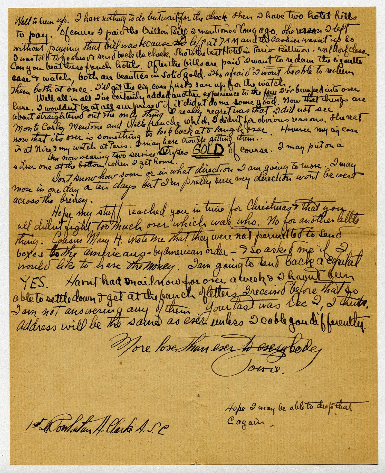 Well to sum up. I have nothing to do but wait for the check then I have two hotel bills to pay. Of course I paid the Crillon Bill I mentioned long ago. The reason I left without paying that bill was because I left at 7 AM and the cashier wasn