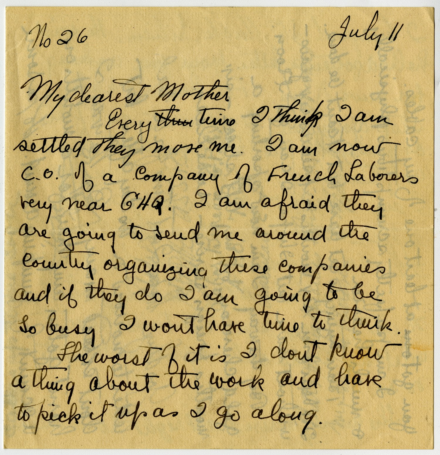 No 26 July 11 My dearest Mother Every time I think I am settled they move me. I am now C.O. of a Company of French Laborers very near GHQ. I am afraid they are going to send me around the country organizing these companies and if they do I am going to be so busy I wont have time to think. The worst of it is I don