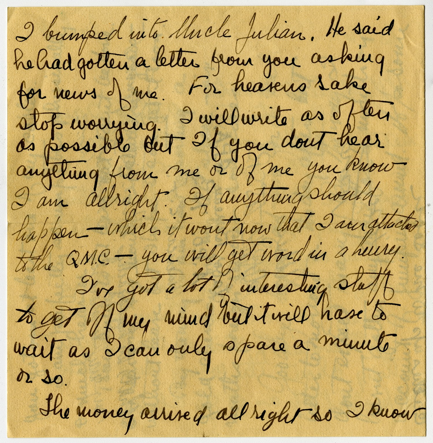 I bumped into Uncle Julian. He said he had gotten a letter from you asking for news of me. For heavens sake stop worrying. I will write as often as possible but if you don