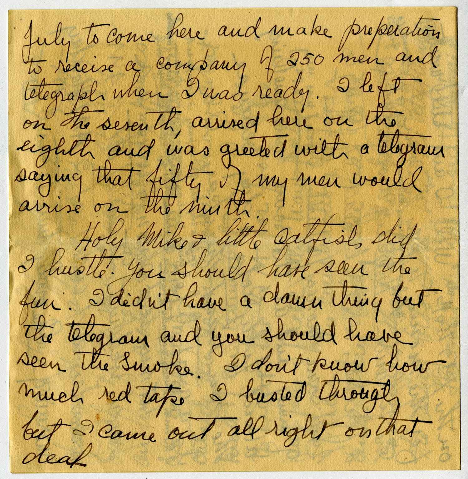 July to come here and make preparation to receive a company of 250 men and telegraph when I was ready. I left on the seventh, arrived here on the eighth and was greeted with a telegram saying that fifty of my men would arrive on the ninth. Holy Mike & little catfish did I hustle. You should have seen the fun. I didn