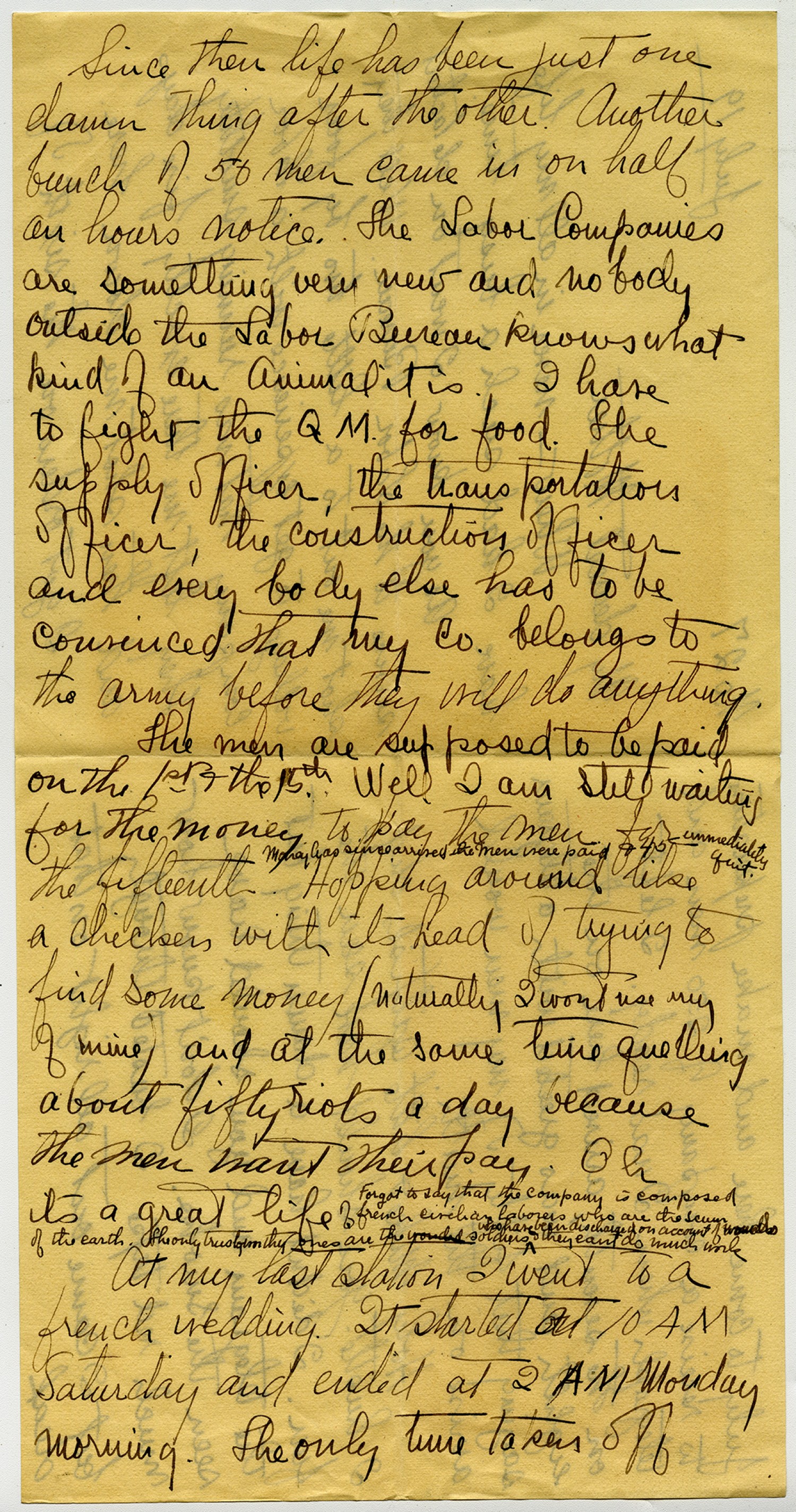 Since then life has just been one damn thing after the other. Another bunch of 50 men came in on half an hours notice. The Labor Companies are something very new and nobody outside the Labor Bureau knows what kind of an animal it is. I have to fight the QM for food. The supply officer, the transportation officer, the construction officer and every body else has to be convinced that my Co. belongs to the army before they will do anything. The men are supposed to be paid on the 1st and 15th. Well I am still waiting for the money to pay the men for the fifteenth. Money has since arrived the man were paid & 45 immediately quit. Hopping around like a chicken with its head of trying to find some money (naturally I wont use any of mine) and at the same time quelling about fifty riots a day because the men want their pay. Oh it