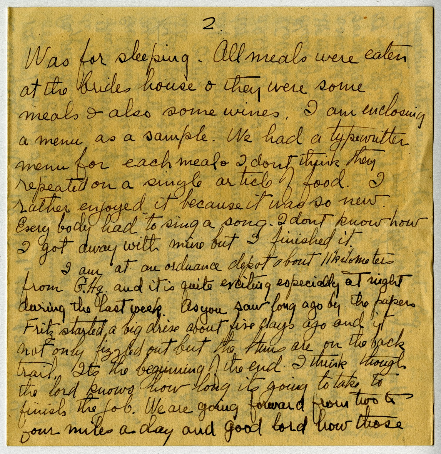[page 2] Was for sleeping. All meals were eaten at the brides house & they were some meals & also some wines. I am enclosing a menu as a sample. We had a typewritten menu for each meal & I don