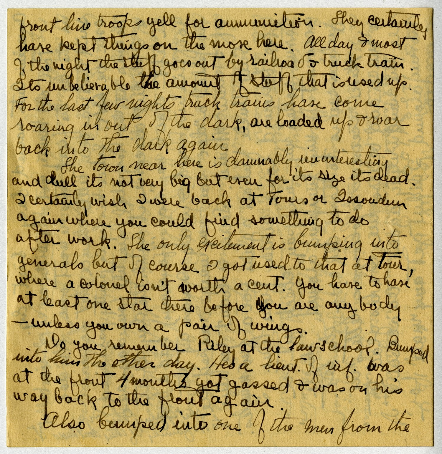 front line troops yell for ammunition. They certainly have kept things on the move here. All day & most of the night the stuff goes out by railroad & truck train. Its unbelievable the amount of stuff that is used up. For the last few nights truck trains have come roaring in out the dark, are loaded up & roar back into the dark again. The town near here is damnably uninteresting and dull its not very big but even for its size its dead. I certainly wish I were back at Tours or Issoudun again where you could find something to do after work. The only excitement is bumping into generals but of course I got used to that at Tour, where a colonel isn
