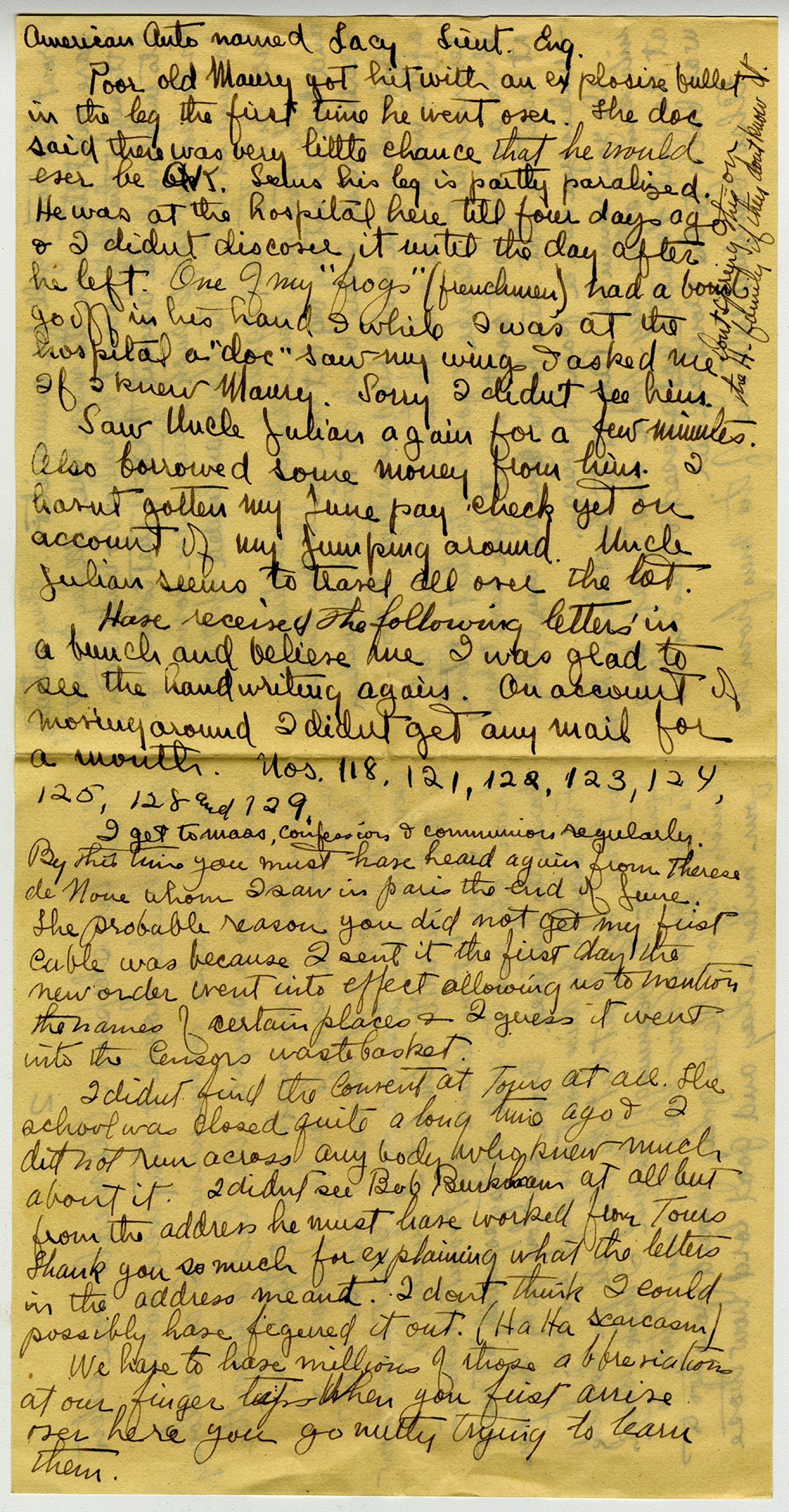 American Auto named Lacy Lieut. Eng. Poor old Maury got hit with an explosive bullet Dont spring this on the H-family if they dont know in the leg the first time he went over. The doc said there was very little chance that he would ever be O.K. Seems his leg is partly paralyzed. He was at the hospital here till four days ago & I didn
