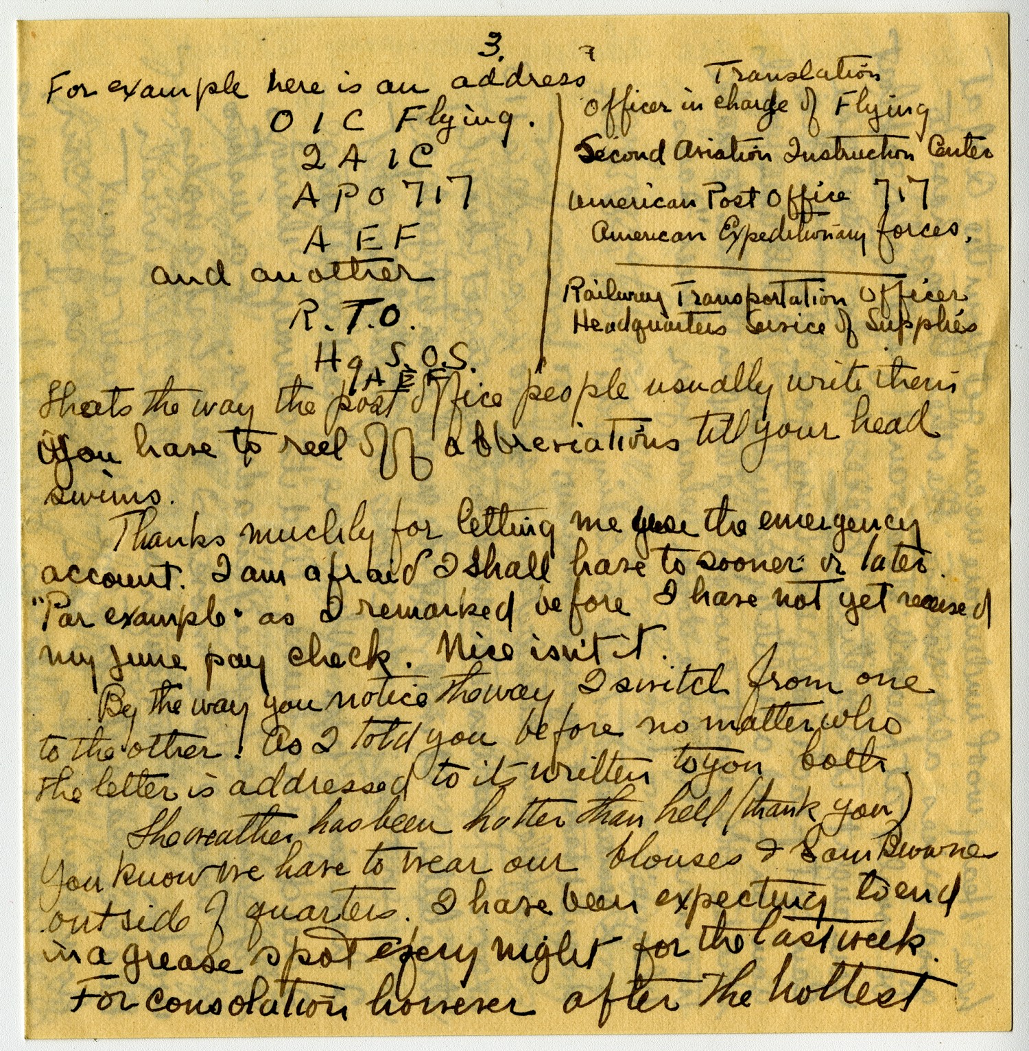 [page 3] For example here is an address O I C Flying 2 A I C A P O 717 A E F and another R.T.O. Hq S.O.S. AEF Translation Officer in charge of flying [OIC Flying] Second Aviation Instruction Center [2AIC] American Post Office 717 [APO 717] American Expeditionary Forces [AEF], - Railway Transportation Officer [R.T.O.] Headquarters Service of Supplies [Hq S.O.S.] That