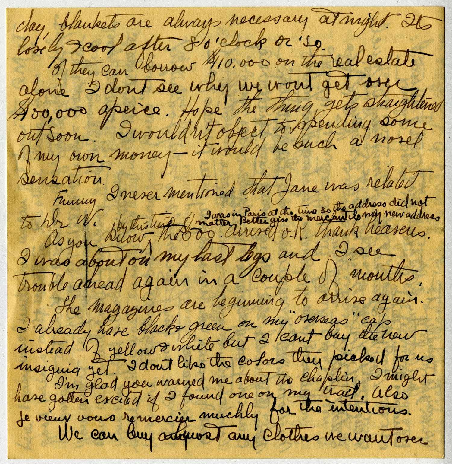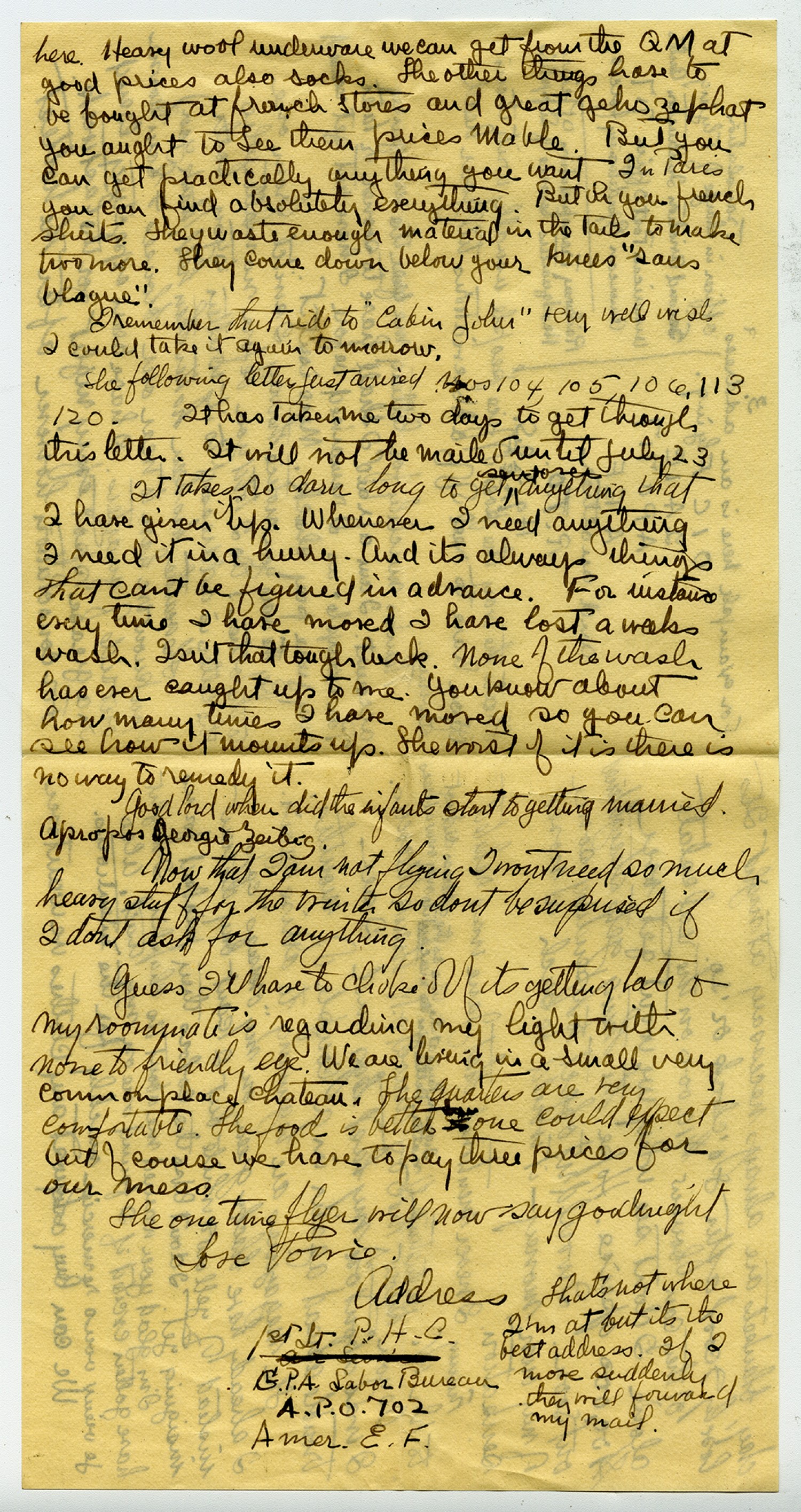 here. Heavy wool underwear we can get from the QM at good prices also socks. The other things have to be bought at French stores and great gehozephat you aught to see them prices Mable. But you can get practically anything you want. In Paris you can find absolutely everything. But oh you French shirts. They waste enough material in the tails to make two more. They come down below your knees