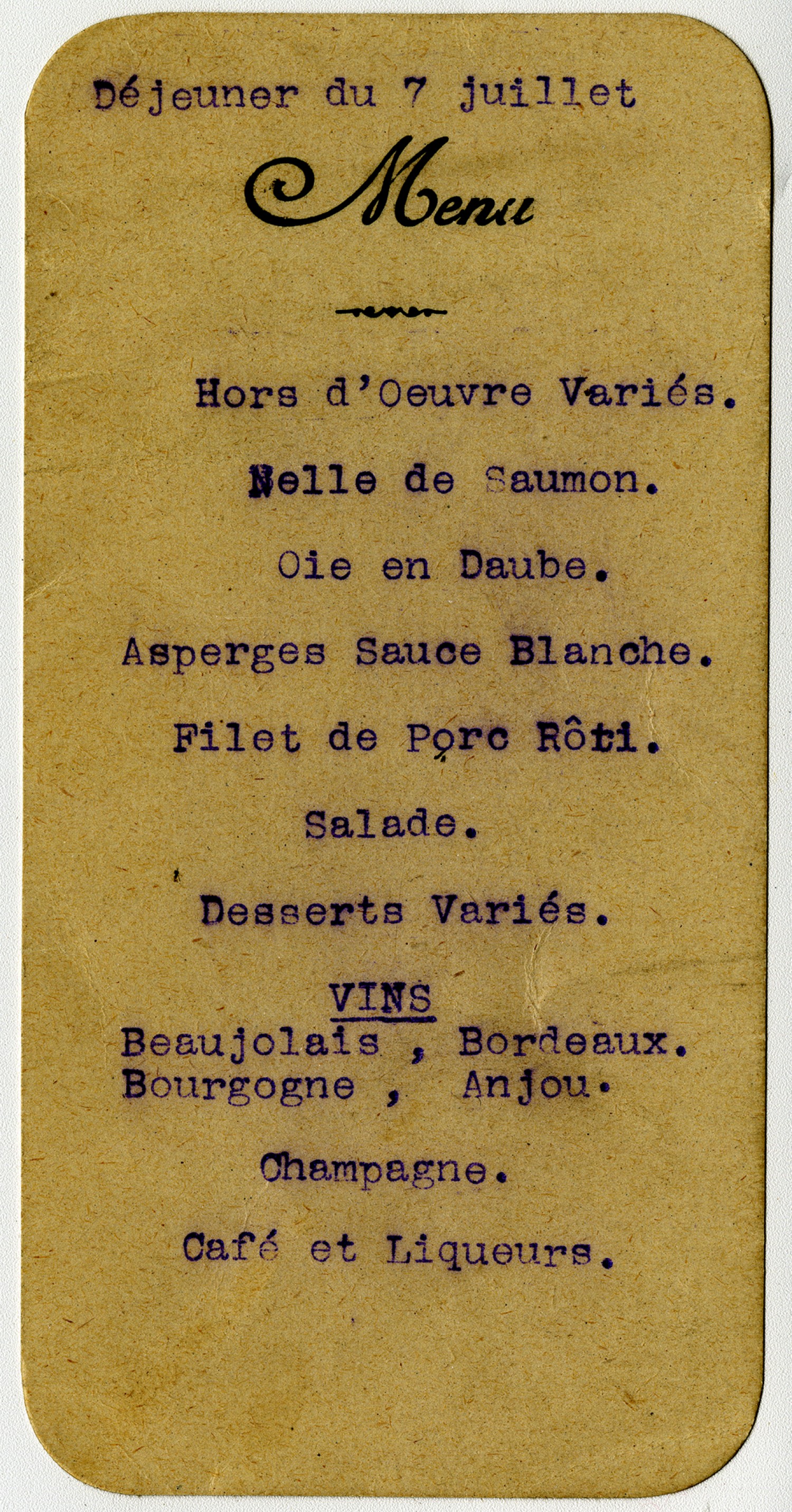 Dejeuner du 7 juillet Menu Hors d Oeuvre Varies. Nelle de Saumon. Oie en Daube. Asperges Sauce Blanche. Filet de Porc Roti. Salade. Desserts Varies. VINS Beaujolais, Bordeaux. Bourgogne, Anjou. Champagne. Caf