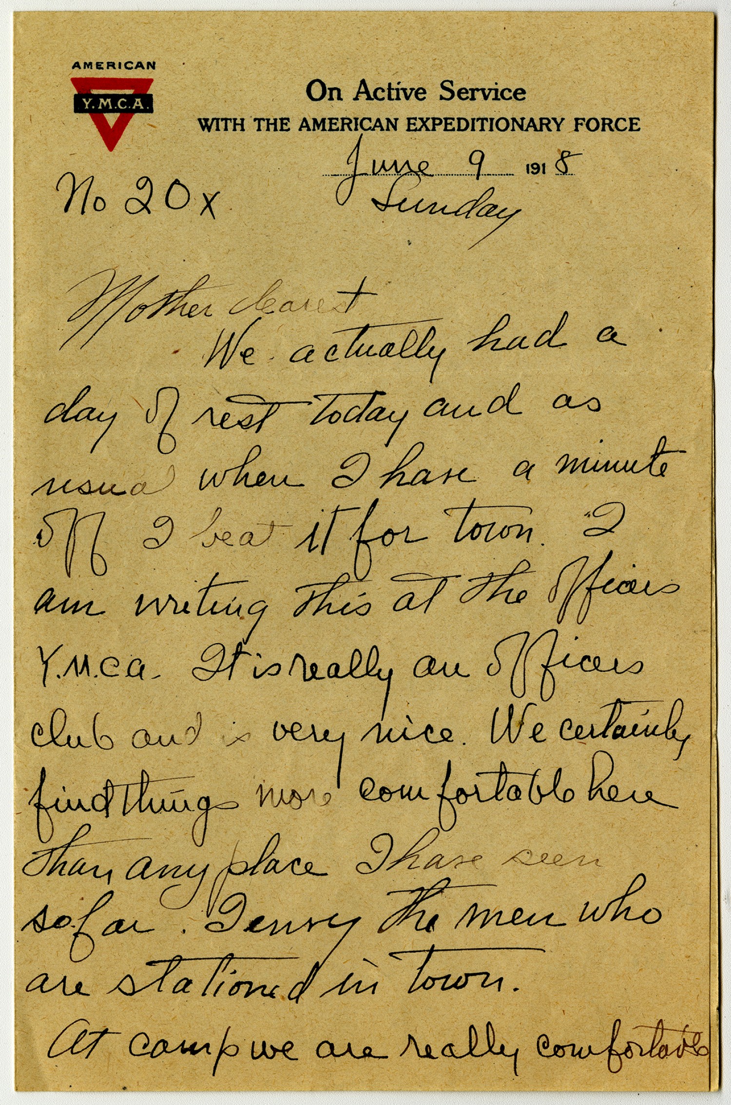 [Y.M.C.A letterhead] June 9 1918 No 20 x Sunday Mother dearest We actually had a day of rest today and as usual when I have a minute off I beat it for town. I am writing this at the officers Y.M.C.A. It is really an Officers club and is very nice. We certainly find things more comfortable here than any other place I have seen so far. I envy the men who are stationed in town. At camps we are really comfortable