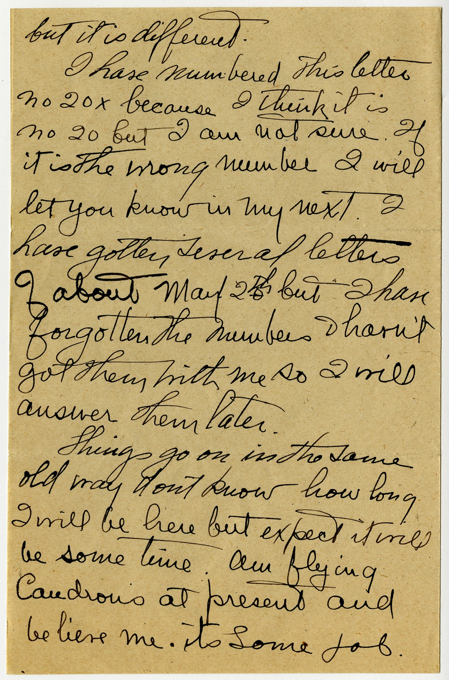 but it is different. I have numbered this letter no 20 x because I think it is no 20 but I am not sure. If it is the wrong number I will let you know in my next. I have gotten several letters of about May 20th but I have forgotten the numbers & havn