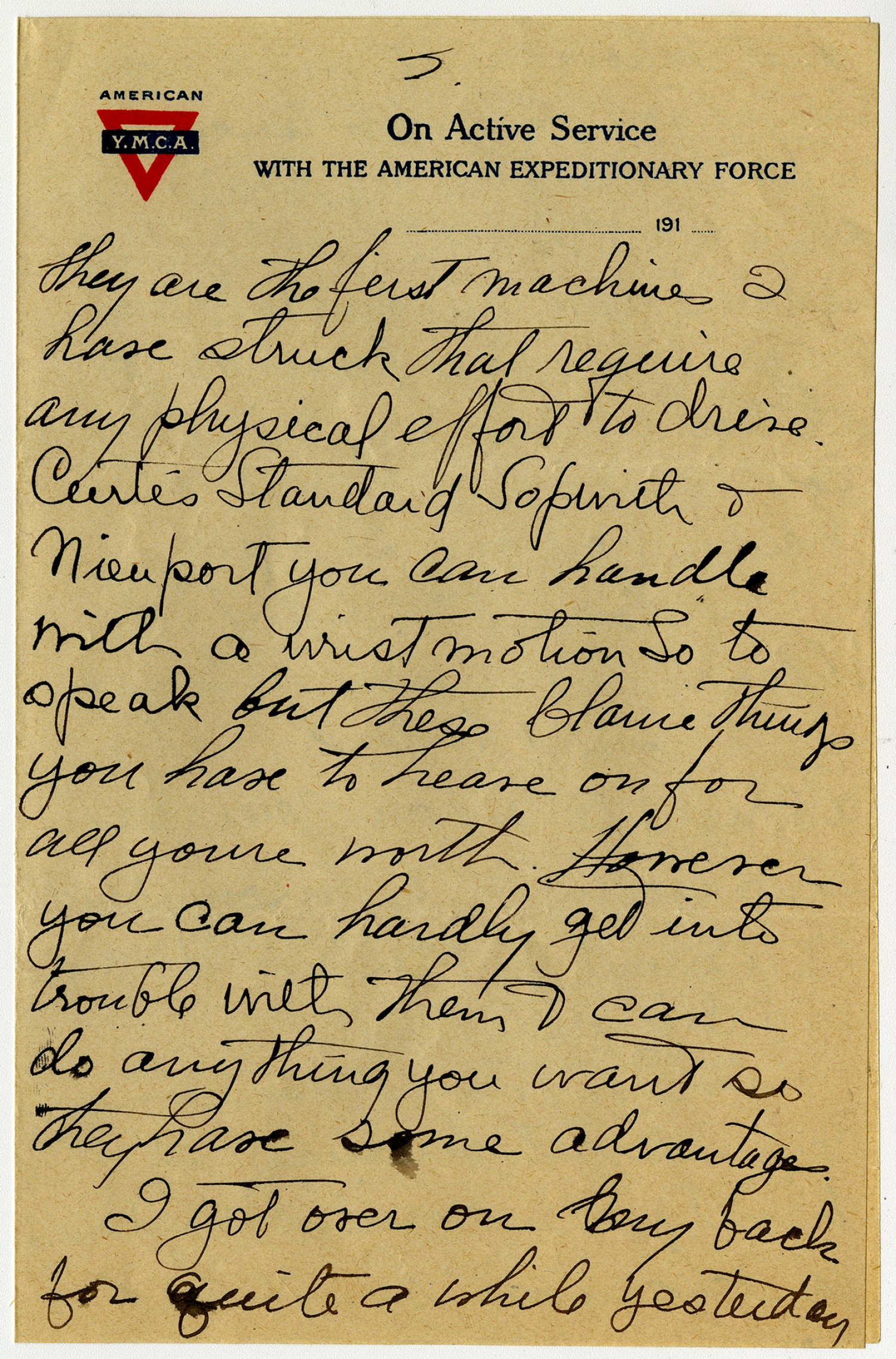 [page 2] [Y.M.C.A. letterhead] they are the first machines I have struck that require any physical effort to drive. Curtis Standard Sopwith & Nieuport you can handle with a wrist motion so to speak but these blame things you have to heave on for all youre worth. However you can hardly get into trouble with them & can do anything you want so they have some advantage. I got over on my back for quite a while yesterday