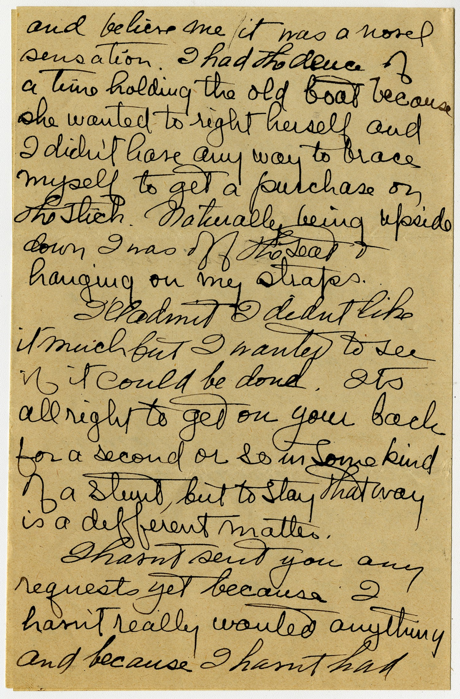 and believe me it was a novel sensation. I had the deuce of a time holding the old boat because she wanted to right herself and I didn