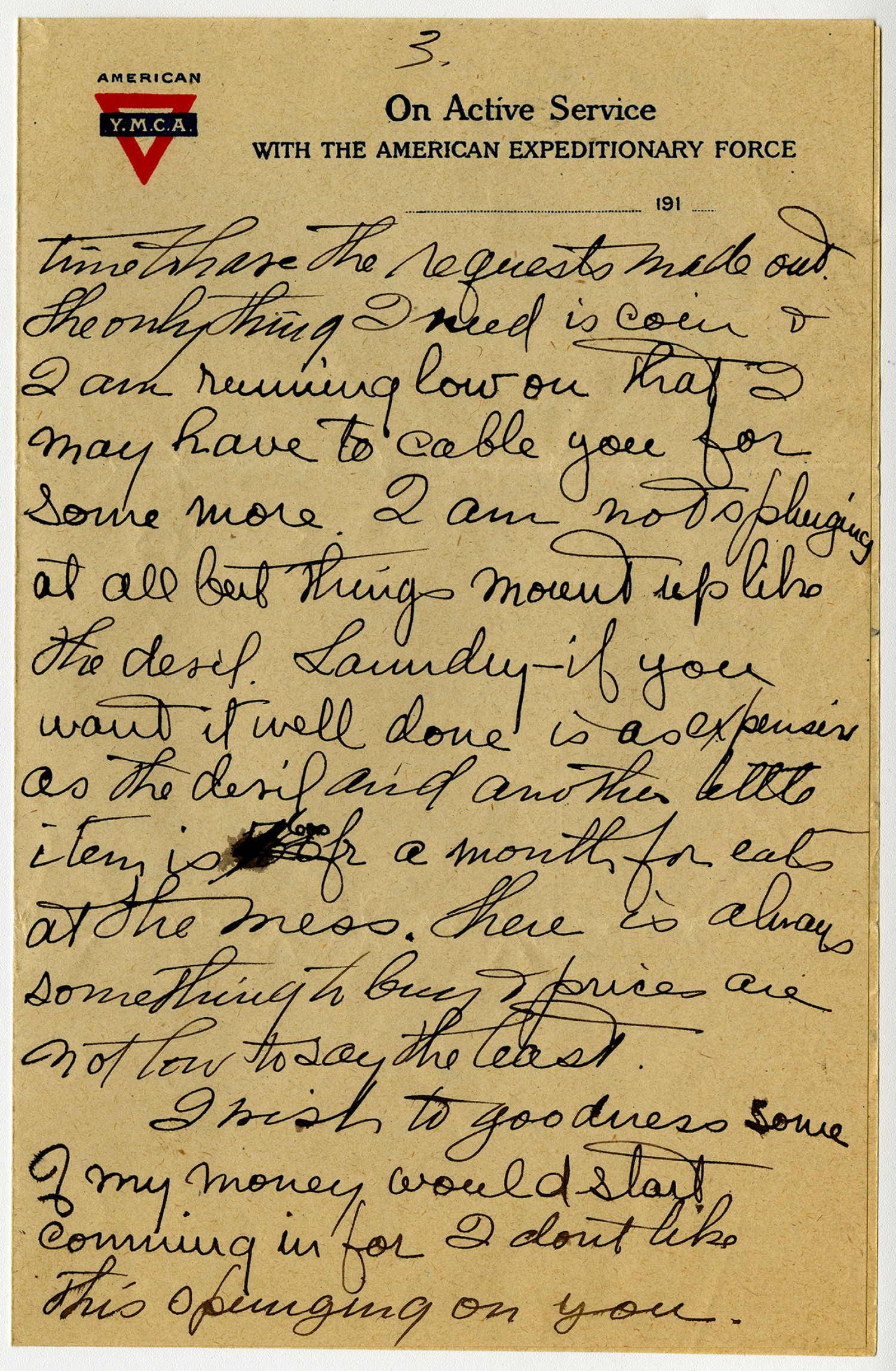 [page 3] [Y.M.C.A. letterhead] time to have the requests made out. The only thing I need is coin & I am running low on that I may have to cable you for some more. I am not splurging at all but things mount up like the devil. Laundry if you want it well done is as expensive as the devil and another little item is 60 fr [francs] a month for eats at the mess. There is always something to buy & the prices are not low to say the least. I wish to goodness some of my money would start coming in for I don