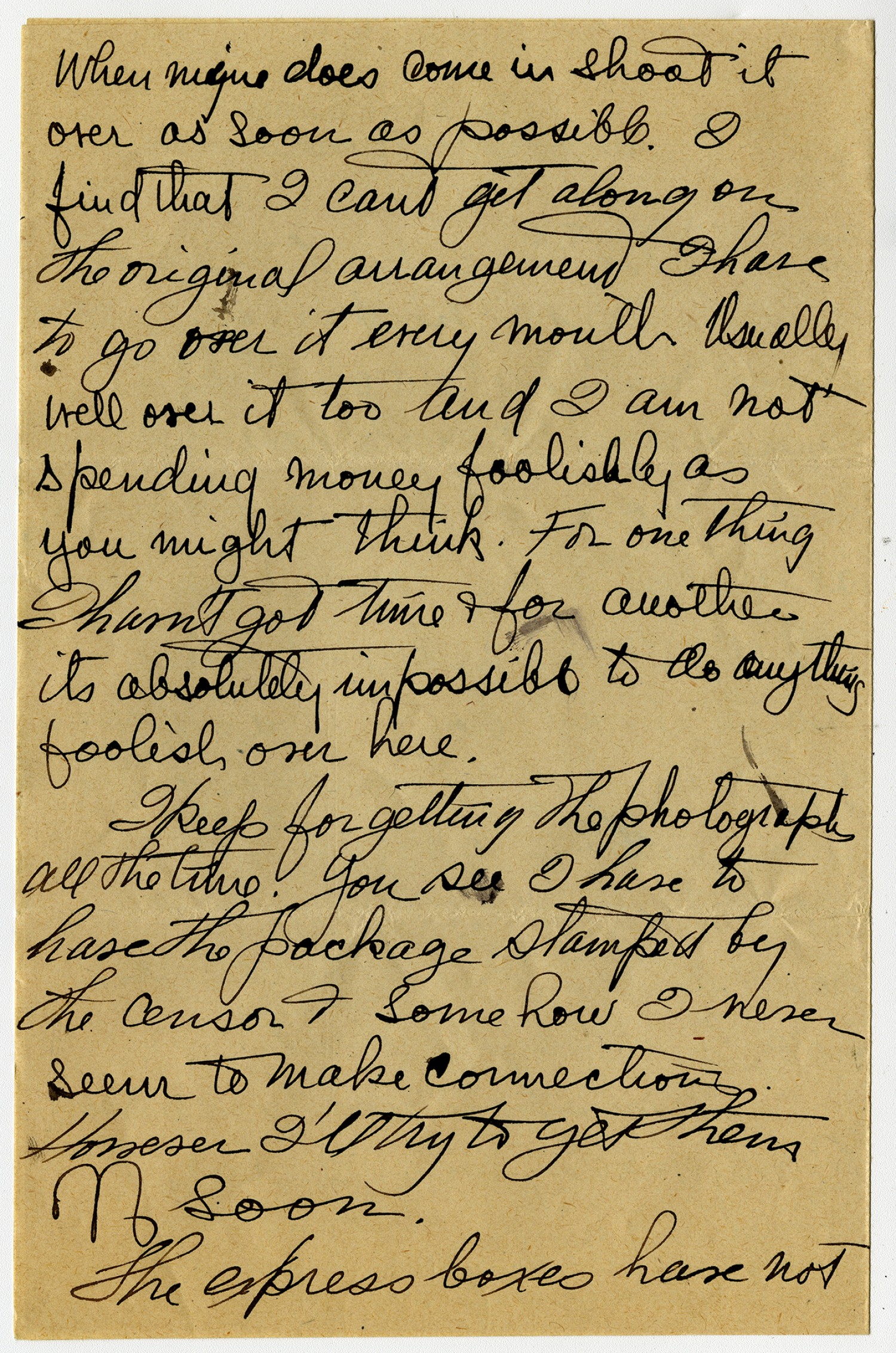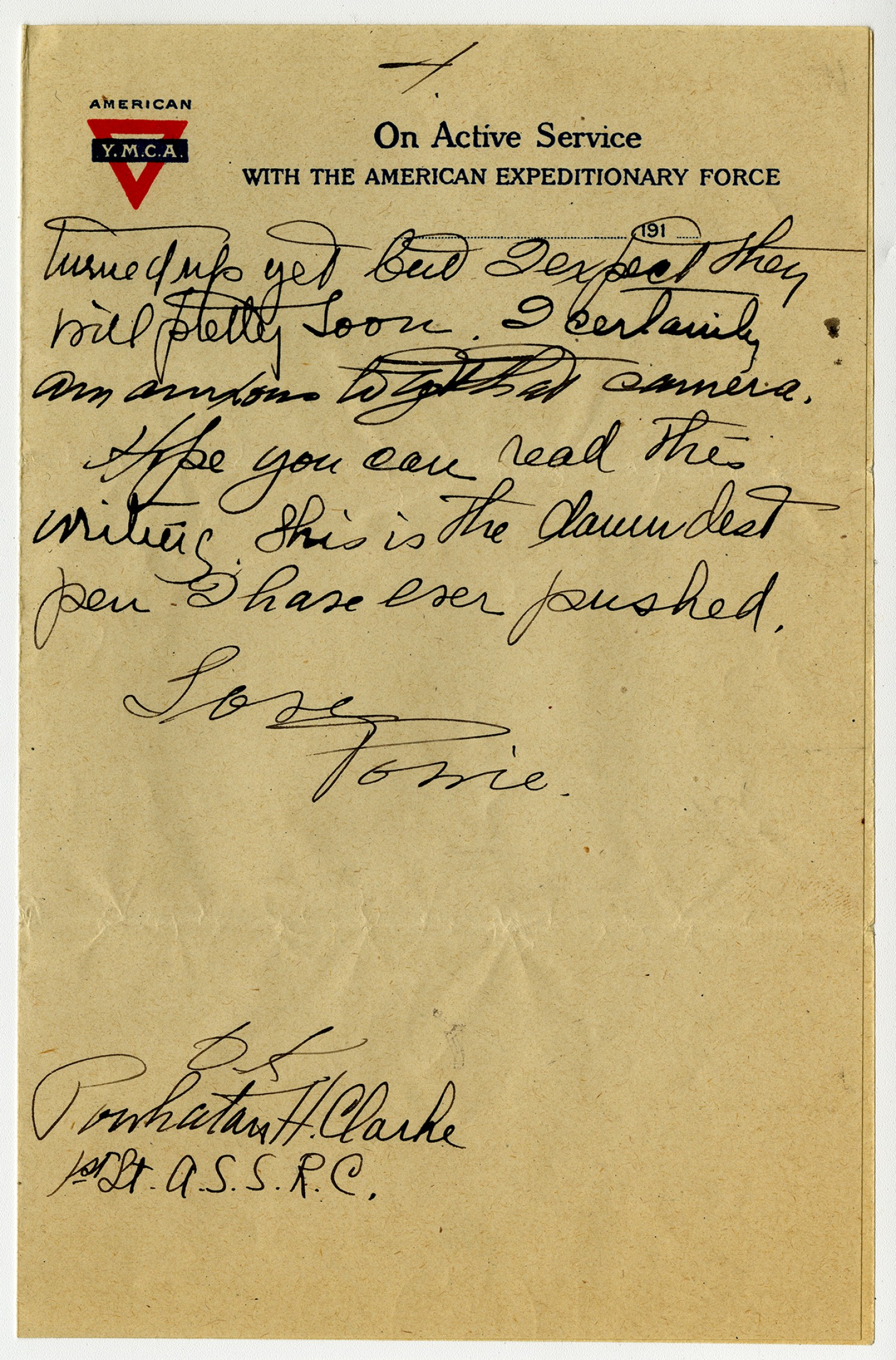 [page 4] [Y.M.C.A. letterhead] turned up yet but I expect they will pretty soon. I certainly am anxious to get that camera. Hope you can read this writing. This is the damndest pen I have ever pushed. Love Powie. O.K. Powhatan H. Clarke 1st Lt. A.S.S.R.C.