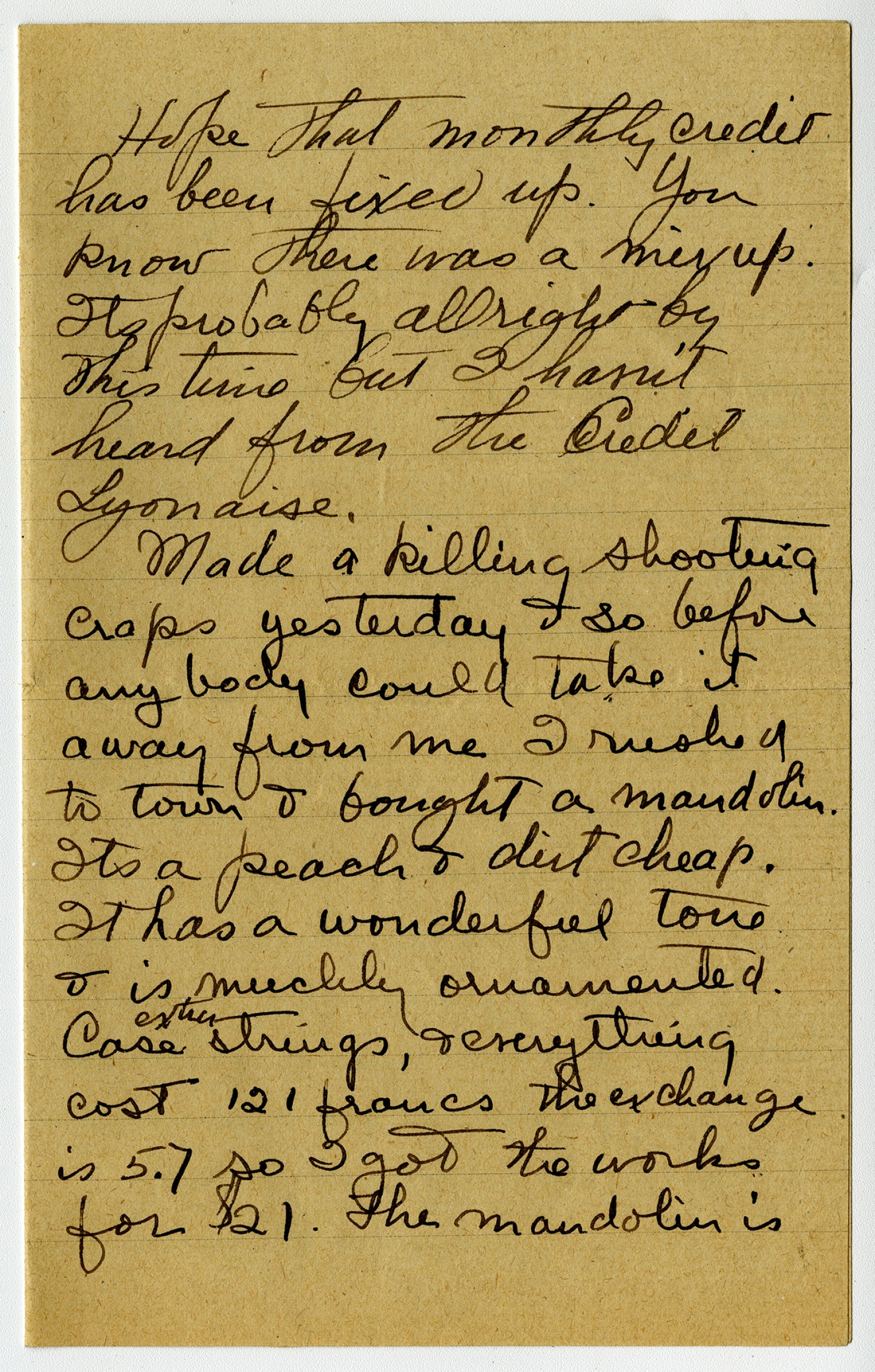 | Description | Powhatan H. Clarke wrote to his mother and asked for cigarettes and a camera. He also mentioned a mandolin he bought with money he won shooting craps. Clarke served with the 21st Aero Squadron and Labor Bureau A.E.F. during Word War I. |