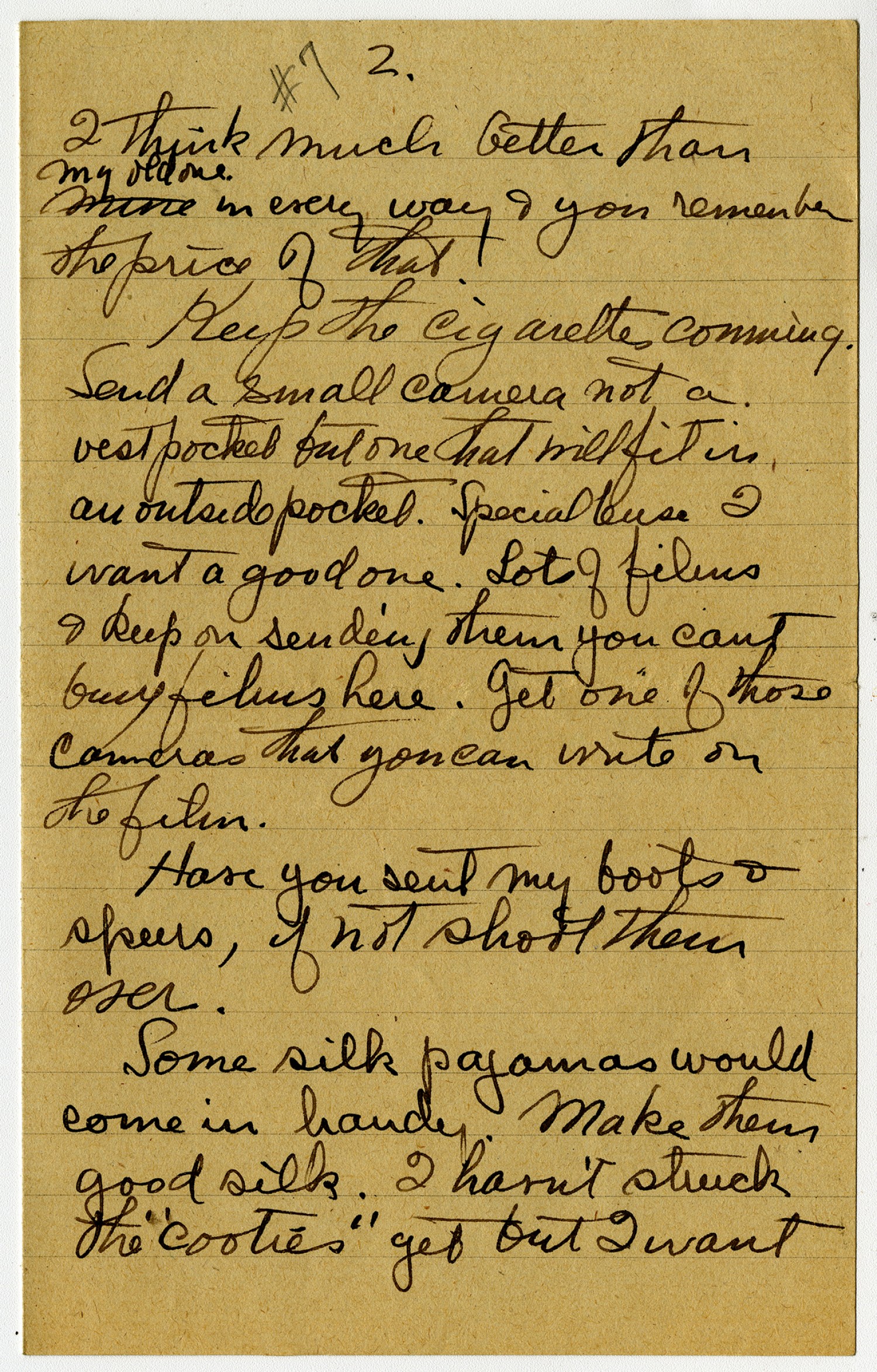 [page 2] #7 I think much better than my old one in every way & you remember the price of that. Keep the cigarettes coming. Send a small camera not a vest pocket but one that will fit in an outside pocket. Special lense I want a good one. Lots of films & keep on sending them you cant buy films here. Get one of those cameras that you can write on the film. Have you sent my boots & spurs, if not shoot them over. Some silk pajamas would come in handy. Make them good silk. I havn