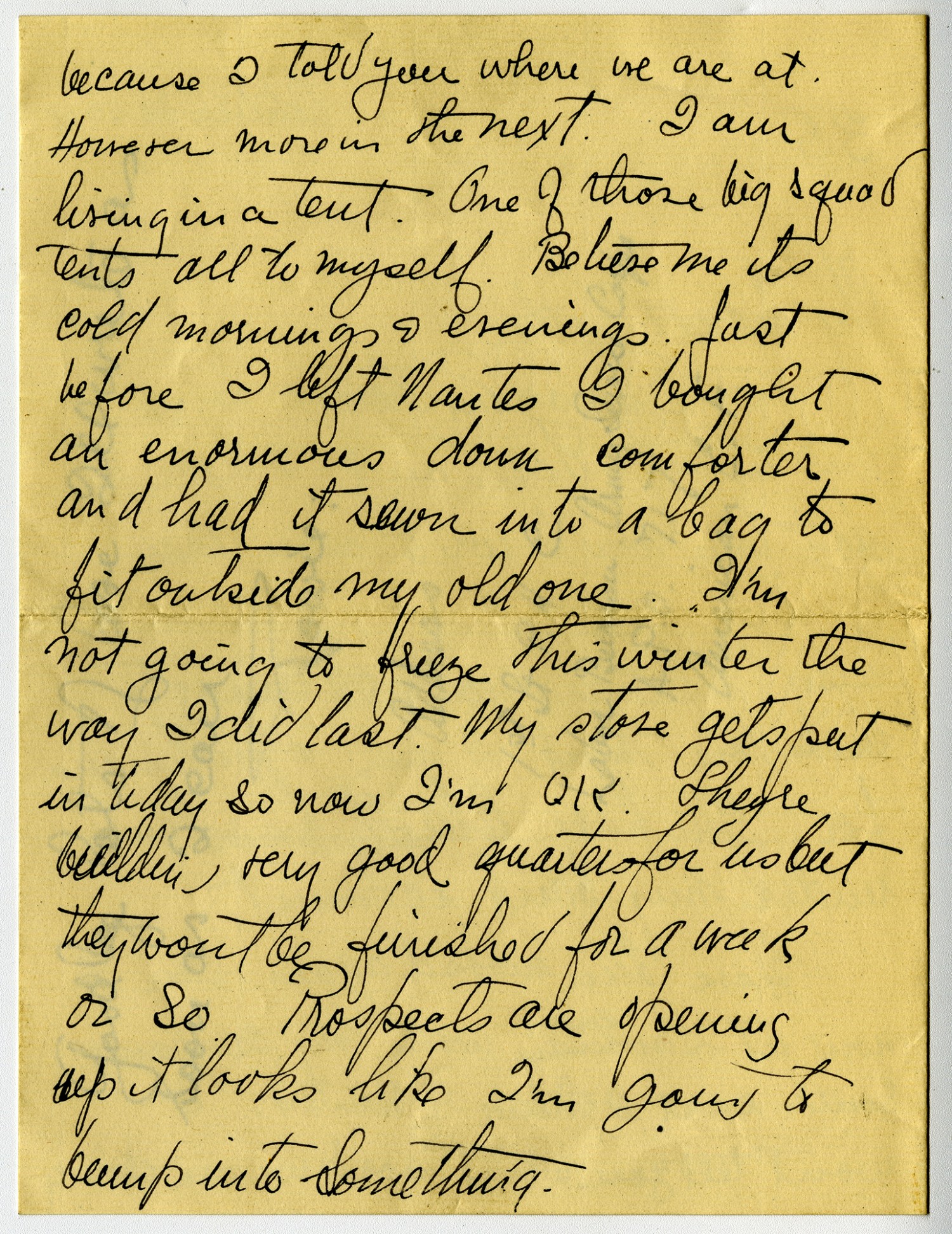 because I told you where we are at. However more in the next. I am living in a tent. One of those big squad tents all to myself. Believe me its cold mornings and evenings. Just before I left Nantes I bought an enormous down comforter and had it sewn into a bag to fit outside my old one. I
