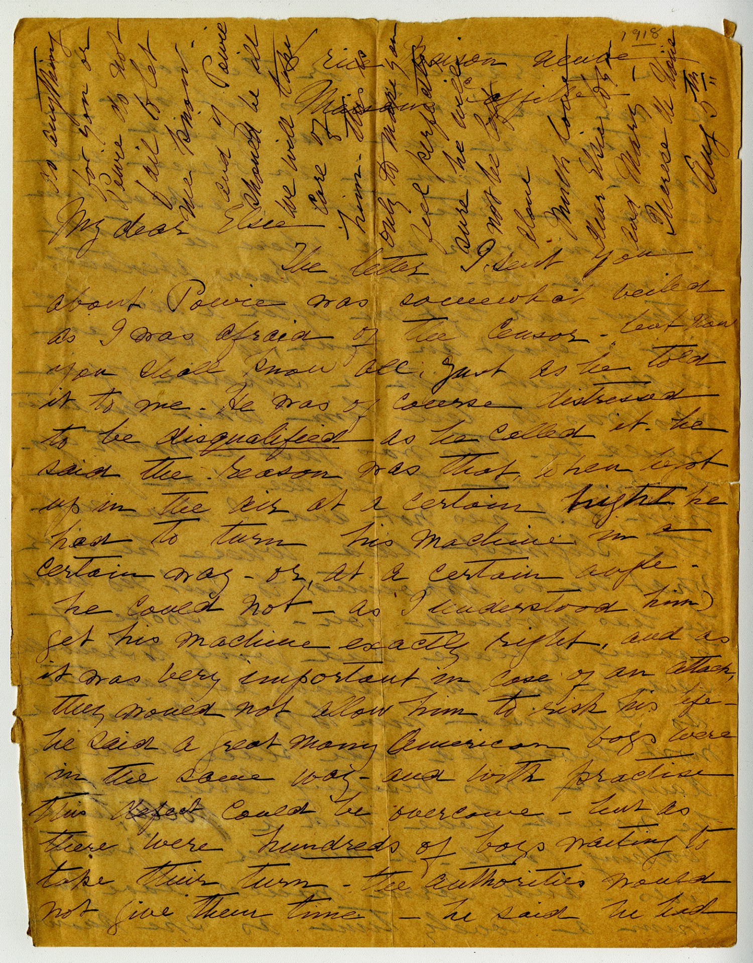 1918 My dear Elsie The letter I sent you about Powie was somewhat veiled as I was afraid of the censor - [ms illegible: 1wd] you shall know all, just as he told it to me. He was of course distressed to be disqualified as he called it. He said the reason was that when he got up in the air at a certain height he had to turn his machine in a certain way