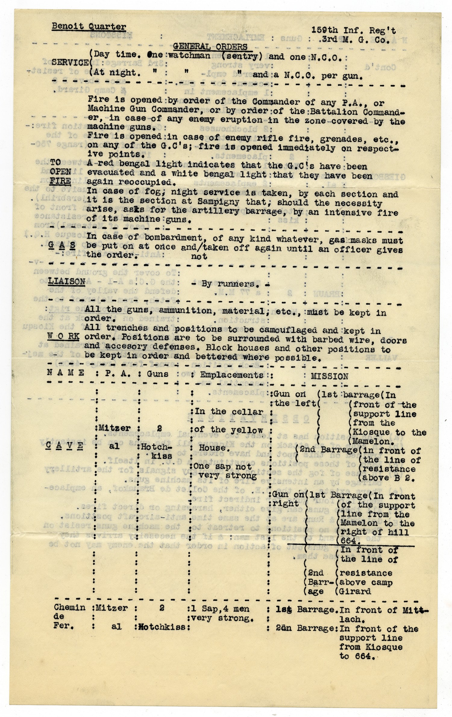 Benoit Quarter 159th Inf. Reg't 3rd M.G. Co. GENERAL ORDERS SERVICE} Day time. One watchman (sentry) and one N.C.O. At night. One watchman (sentry) and a N.C.O. per gun. Fire is opened by order of the Commander of any P.A., or Machine Gun Commander, or by order of the Battalion Commander, in case of any enemy eruption in the zone covered by the machine guns. Fire is opened in case of enemy rifle fire, grenades, etc., on any of the G.C.'s; fire is opened immediately on respective points. TO OPEN FIRE A red bengal light indicates that the G.C.'s have been evacuated and a white bengal light that they have been again reoccupied. In case of fog; night service is taken, by each section and it is the section at Sampigny that, should the necessity arise, asks for the artillery barrage, by an intensive fire of its machine guns. GAS In case of bombardment, of any kind whatever, gas masks must be put on at once and not taken off again until an officer gives the order. LIAISON - By runners.- WORK All the guns, ammunition, material, etc., must be kept in order. All trenches and positions to be camouflaged and kept in order. Positions are to be surrounded with barbed wire, doors and accesory defenses. Block houses and other positions to be kept in order and bettered where possible. [NAME] CAVE [P.A.] Mitzer al [Guns] 2 Hotchkiss [Emplacements] In the cellar of the yellow House. One sap not very strong [MISSION] Gun on the left (1st barrage(In front of the support line from the Kiosque to the Mamelon. (2nd Barrage (in front of the line of resistance above B 2. Gun on right (1st Barrage (In front of the support line from the Mamelon to the right of hill 664. (In front of the line of (2nd Barrage- (resistance above camp Girard [NAME] Chemin de Fer. [P.A.] Mitzer al [Guns] 2 Hotchkiss [Emplacements] 1 Sap, 4 men very strong. [MISSION] 1st Barrage. In front of Mitlach. 2nd Barrage: In front of the support line from Kiosque to 664.