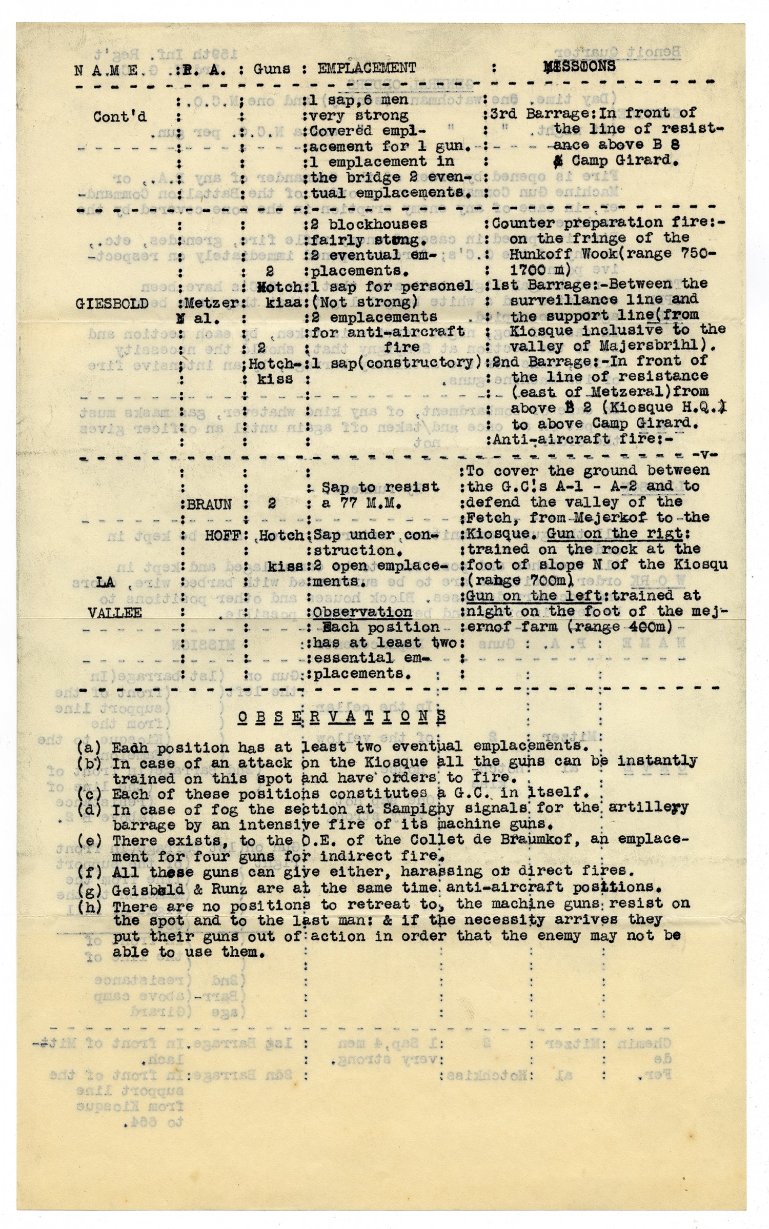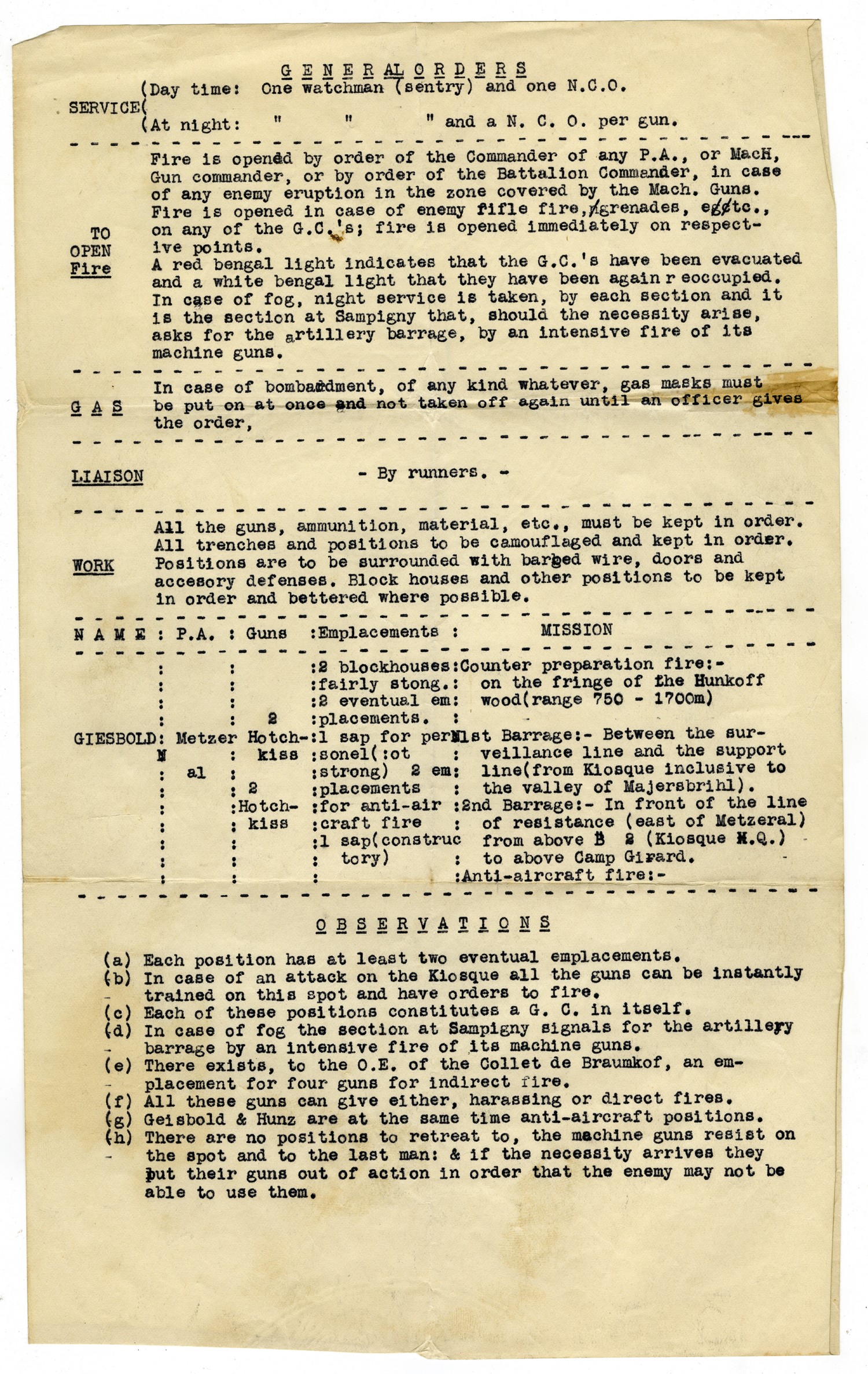 GENERAL ORDERS SERVICE (Day time: One watchman (sentry) and one N.C.O. At night: One watchman (sentry) and a N.C.O. per gun. TO OPEN Fire Fire is opened by order of the Commander of any P.A., or MacH, Gun commander, or by order of the Battalion Commander, in case of any enemy eruption in the zone covered by the Mach. Guns. Fire is opened in case of enemy rifle, grenades, etc., on any of the G.C.'s; fire is opened immediately on respective points. A red bengal light indicates that the G.C.'s have been evacuated and a white bengal light that they have been again reoccupied. In case of fog, night service is taken, by each section and it is the section at Sampigny that, should the necessity arise, asks for the artillery barrage, by an intensive fire of its machine guns. GAS In case of bombardment, of any kind whatever, gas masks must be put on at once and not taken off again until an officer gives the order, LIAISON -By runners.- WORK All the guns, ammunition, material, etc., must be kept in order. All trenches and positions to be camouflaged and kept in order. Positions are to be surrounded with barbed wire, doors and accesory defenses. Block houses and other positions to be kept in order and bettered where possible. [NAME] GIESBOLD [P.A.] Metzeral [Guns] 2 Hotchkiss 2 Hotchkiss [Emplacements] 2 blockhouses fairly strong. 2 eventual emplacements. 1 sap for personel (: ot strong) 2 emplacements for anti-aircraft fire 1 sap (constructory) [MISSION] Counter preparation fire:- on the fringe of the Hunkoff wood (range 750 - 1700m) 1st Barrage:- Between the surveillance line and the support line (form Kiosque inclusive to the valley of Majersbrihl). 2nd Barrage:- In front of the line of resistance (east of Metzeral) from above B 2 (Kiosque H.Q.) to above Camp Girard. Anti-aircraft fire:- OBSERVATIONS (a) Each position has at least two eventual emplacements. (b) In case of an attack on the Kiosque all the guns can be instantly trained on this spot and have order to fire. (c) Each of these positions constitutes a G.C. in itself. (d) In case of fog the section at Sampigny signals for the artillery barrage by an intensive fire of its machine guns. (e) There exists, to the O.E. of the Collet de Braumkof, an emplacement for four guns for indirect fire. (f) All these guns can give either, harassing or direct fires. (g) Geisbold & Hunz are at the same time anti-aircraft positions. (h) There are no positions to retreat to, the machine guns resist on the spot and to the last man: & if the necessity arrives they put their guns out of action in order that the enemy may not be able to use them.