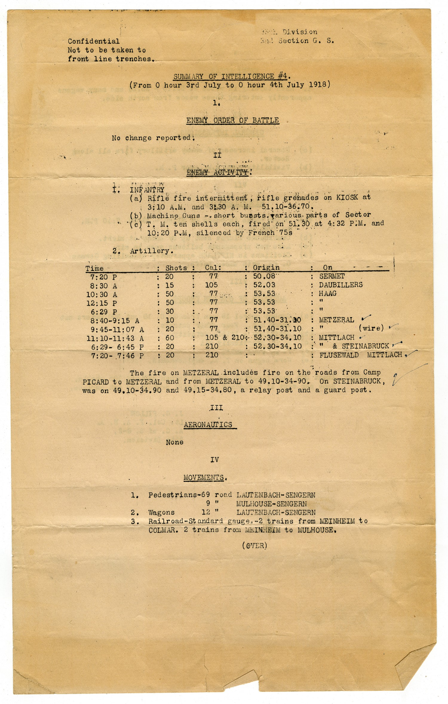 Confidential Not to be taken to front line trenches. 35th Division 2nd Section G.S. SUMMARY OF INTELLIGENCE #4. (From 0 hour 3rd July to 0 hour 4th July 1918) 1. ENEMY ORDER OF BATTLE No change reported. II ENEMY ACTIVITY. I. INFANTRY (a) Rifle fire intermittent, rifle grenades on KIOSK at 3:10 A.M. and 3:30 A.M. 51.10-36.70. (b) Machine Guns - short bursts various parts of Sector (c) T.M. ten shells each, fired on 51.30 at 4:32 P.M. and 10:20 P.M, silenced by French 75s 2. Artillery. [Time] 7:20 P [Shots] 20 [Cal] 77 [Origin] 50.08 [On] SERMET [Time] 8:30 A [Shots] 15 [Cal] 105 [Origin] 52.03 [On] DAUBILLERS [Time] 10:30 A [Shots] 50 [Cal] 77 [Origin] 53.53 [On] HAAG [Time] 12:15 P [Shots] 50 [Cal] 77 [Origin] 53.53 [On] HAAG [Time] 6:29 P [Shots] 30 [Cal] 77 [Origin] 53.53 [On] HAAG [Time] 8:40-9:15 A [Shots] 10 [Cal] 77 [Origin] 51.40-31.10 [On] METZERAL [Time] 9:45-11:07 A [Shots] 20 [Cal] 77 [Origin] 51.40-31.10 [On] METZERAL (wire) [Time] 11:10-11:43 A [Shots] 60 [Cal] 105 & 210 [Origin] 52.30-34.10 [On] MITTLACH [Time] 6:29-6:45 P [Shots] 20 [Cal] 210 [Origin] 52.30-34.10 [On] MITTLACH & STEINABRUCK [Time] 7:20-7:46 P [Shots] 20 [Cal] 210 [Origin] [On] FLUSEWALD MITTLACH The fire on METZERAL includes fire on the roads from Camp Picard to METZERAL and from METZERAL to 49.10-34-90. On STEINABRUCK, was on 49.10-34.90 and 49.15-34.80, a relay post and a guard post. III AERONAUTICS None IV MOVEMENTS. 1. Pedestrians-69 road LAUTENBACH-SENGERN 9 road MULHOUSE-SENGERN 2. Wagons 12 road LAUTENBACH-SENGERN 3. Railroad-Standard gauge. -2 trains from MEINHEIM to COLMAR. 2 trains from MEINHEIM to MULHOUSE. (OVER)