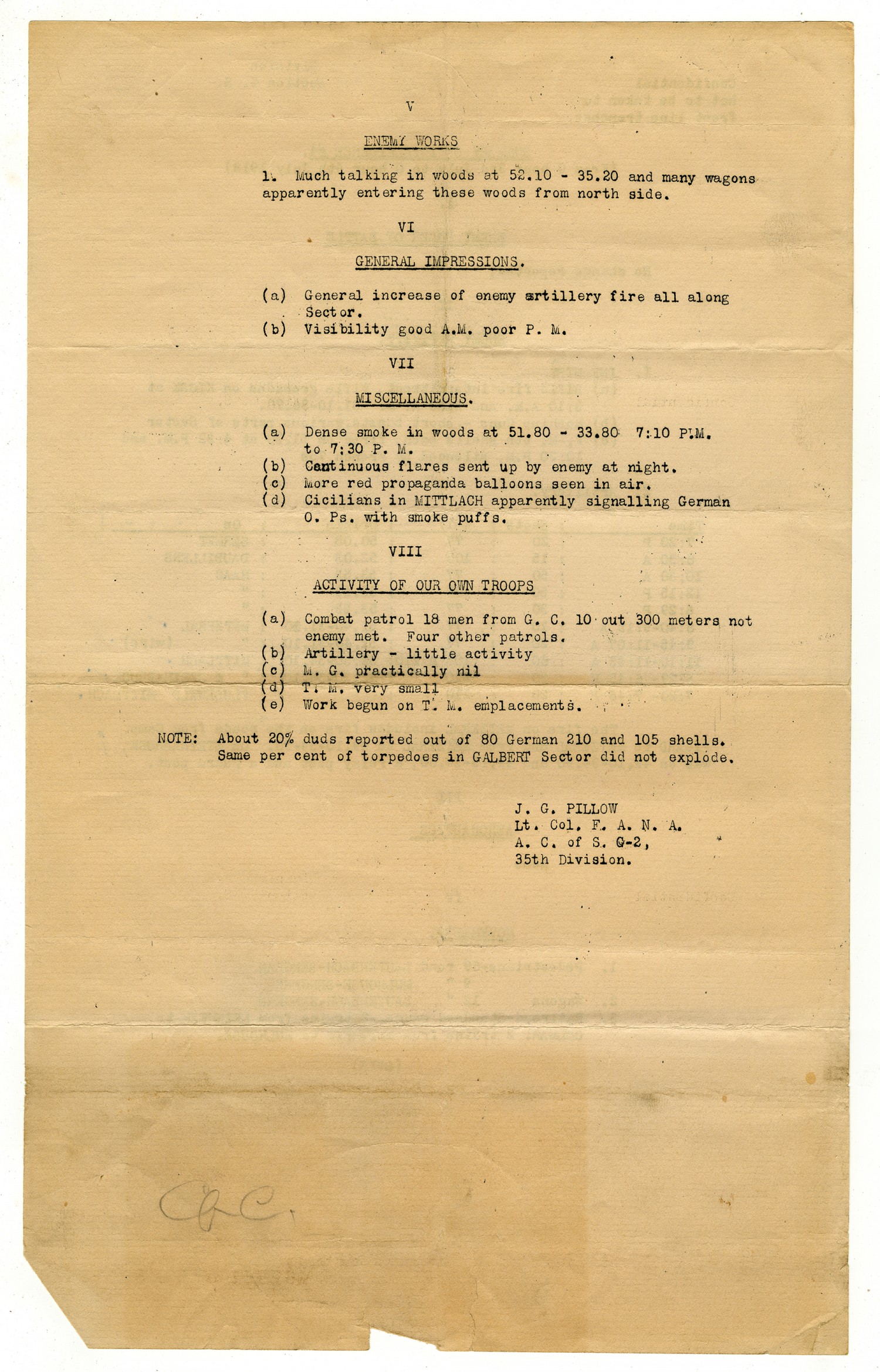 V ENEMY WORKS 1. Much talking in woods at 52.10-35.20 and many wagons apparently entering these woods from north side. VI GENERAL IMPRESSIONS. (a) General increase of enemy artillery fire all along Sector. (b) Visibility good A.M. poor P.M. VII MISCELLANEOUS. (a) Dense smoke in woods at 51.80 - 33.80 7:10 P.M. to 7:30 P.M. (b) Continuous flares sent up by enemy at night. (c) More red propaganda balloons seen in air. (d) Cicilians in MITTLACH apparently signalling German O.Ps. with smoke puffs. VIII ACTIVITY OF OUR OWN TROOPS (a) Combat patrol 18 men from G.C. 10 out 300 meters not enemy met. Four other patrols. (b) Artillery - little activity (c) M.G. practically nil (d) T.M. very small (e) Work begun on T.M. emplacements. NOTE: About 20% duds reported out of 80 German 210 and 105 shells. Same per cent of torpedoes in GALBERT Sector did not explode. J.G. PILLOW Lt. Col. F.A. N.A. A.C. of S. G-2, 35th Division.