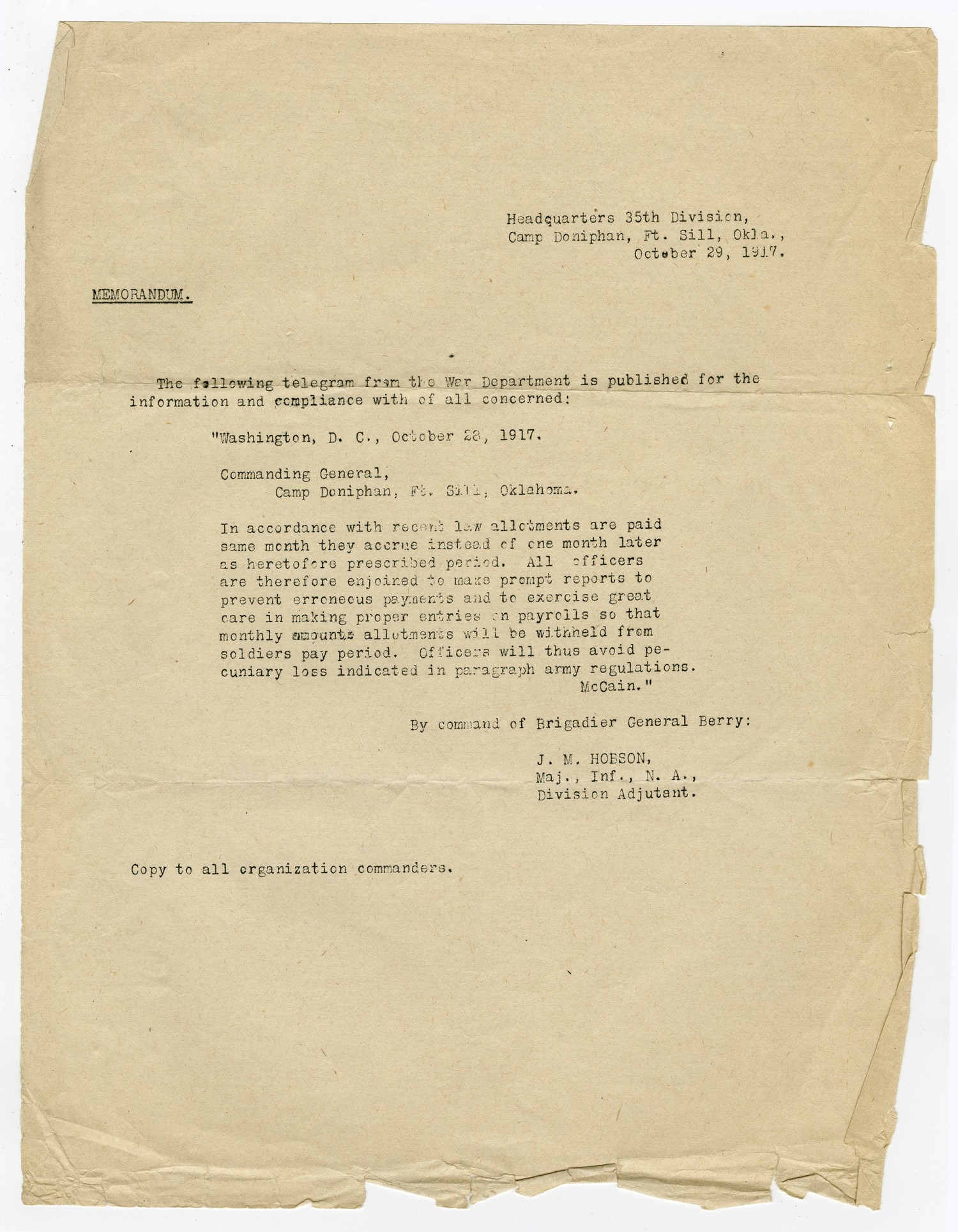 Headquarters 35th Division, Camp Doniphan, Ft. Sill, [Oklahoma], October 29, 1917. MEMORANDUM. The following telegram from the War Department is published for the information and compliance with of all concerned: "Washington, D.C., October 28, 1917. Commanding General, Camp Doniphan, Ft. Sill, Oklahoma. In accordance with recent law allotments are paid same month they accrue instead of one month later as heretofore prescribed period. All officers are therefore enjoined to make prompt reports to prevent erroneous payments and to exercise great care in making proper entries on payrolls so that monthly amounts allotments will be withheld from soldiers pay period. Officers will thus avoid pecuniary loss indicated in paragraph army regulations. McCain." By command of Brigadier General Berry: J.M. Hobson, Maj., Inf., N.A., Division Adjutant. Copy to all organization commanders.