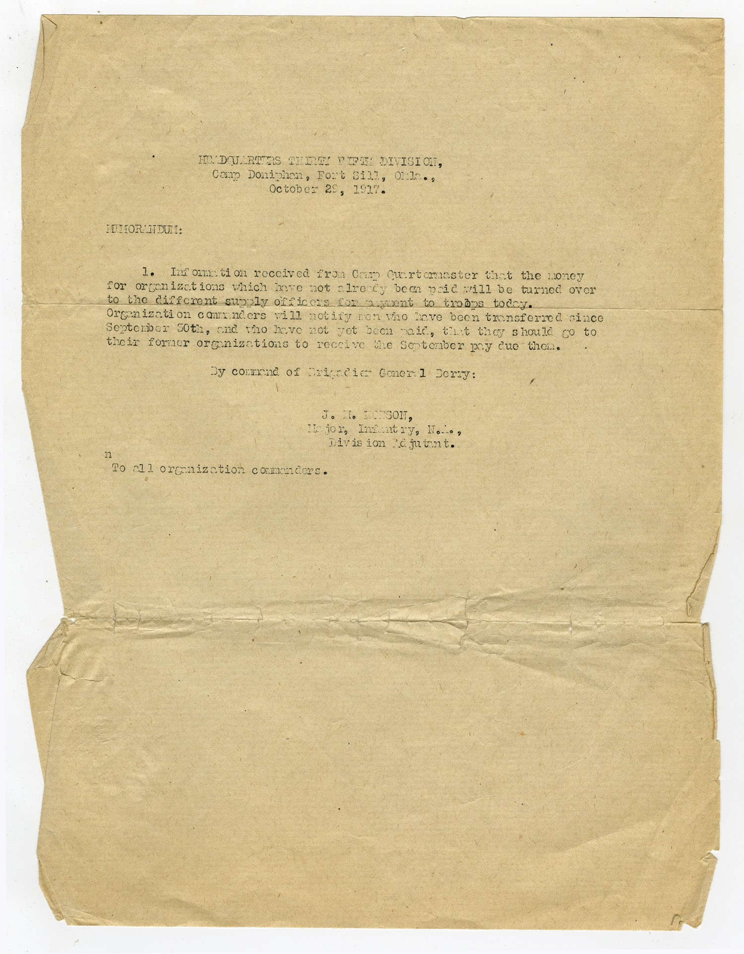 HEADQUARTERS THIRTY FIFTH DIVISION, Camp Doniphan, Fort Sill, [Oklahoma], October 29, 1917. MEMORANDUM: 1. Information received from Camp Quartermaster that the money for organizations which have not already been paid will be turned over to the different supply officers for payment to troops today. Organization commanders will notify men who have been transferred since September 30th, and who have not yet been paid, that they should go to their former organizations to receive the September pay due them. By command of Brigadier General Berry: J.M. Morson, Major, Infantry, N.A., Division Adjutant. n To all organization commanders.