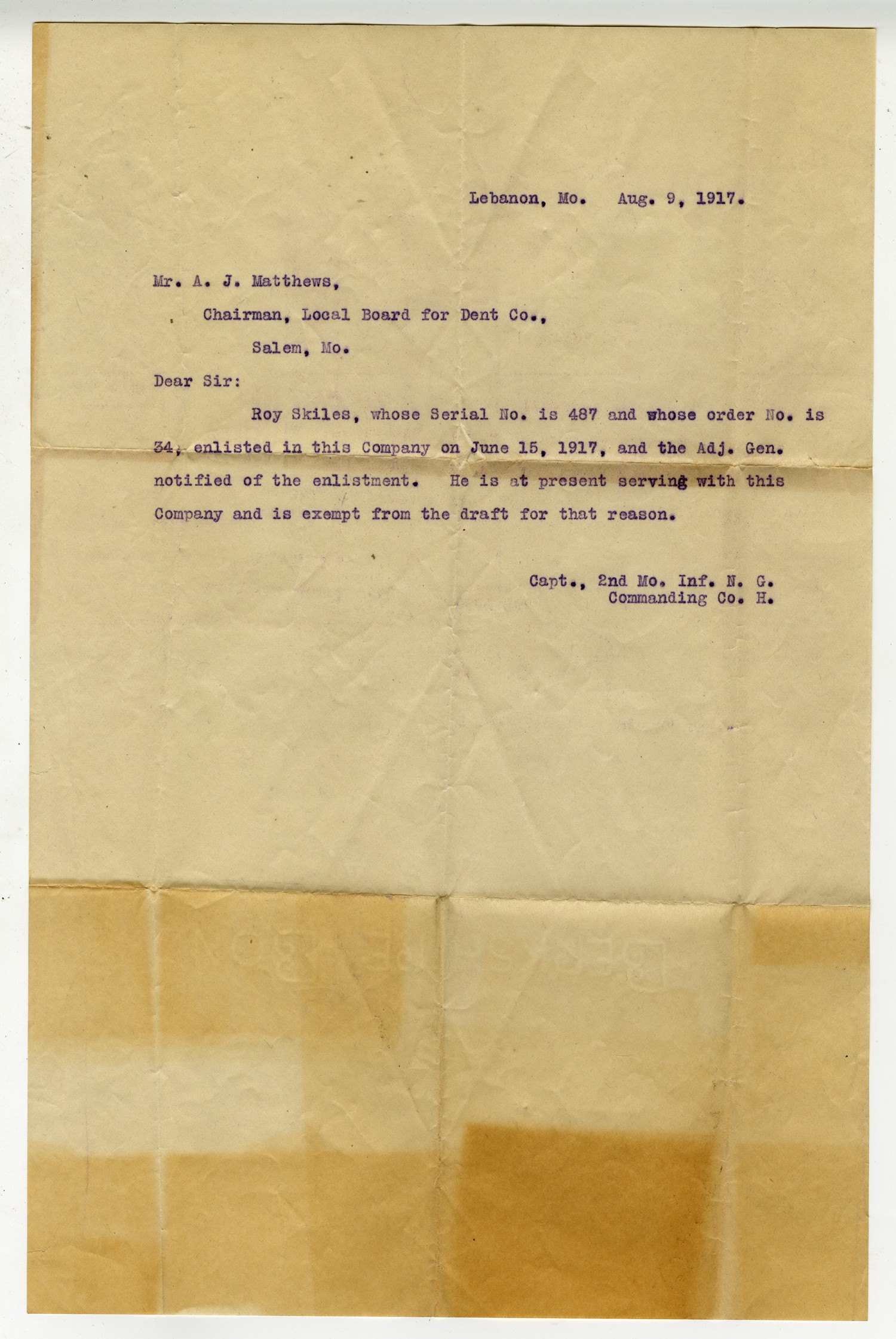 Lebanon, [Missouri]. [August] 9, 1917. Mr. A. J. Matthews, Chairman, Local Board for Dent Co., Salem, [Missouri]. Dear Sir: Roy Skiles, whose Serial No. is 487 and whose order No. is 34, enlisted in this Company on June 15, 1917, and the Adj. Gen. notified of the enlistment. He is at present serving with this Company and is exempt from the draft for that reason. Capt., 2nd [Missouri] Inf. N. G. Commanding Co. H.