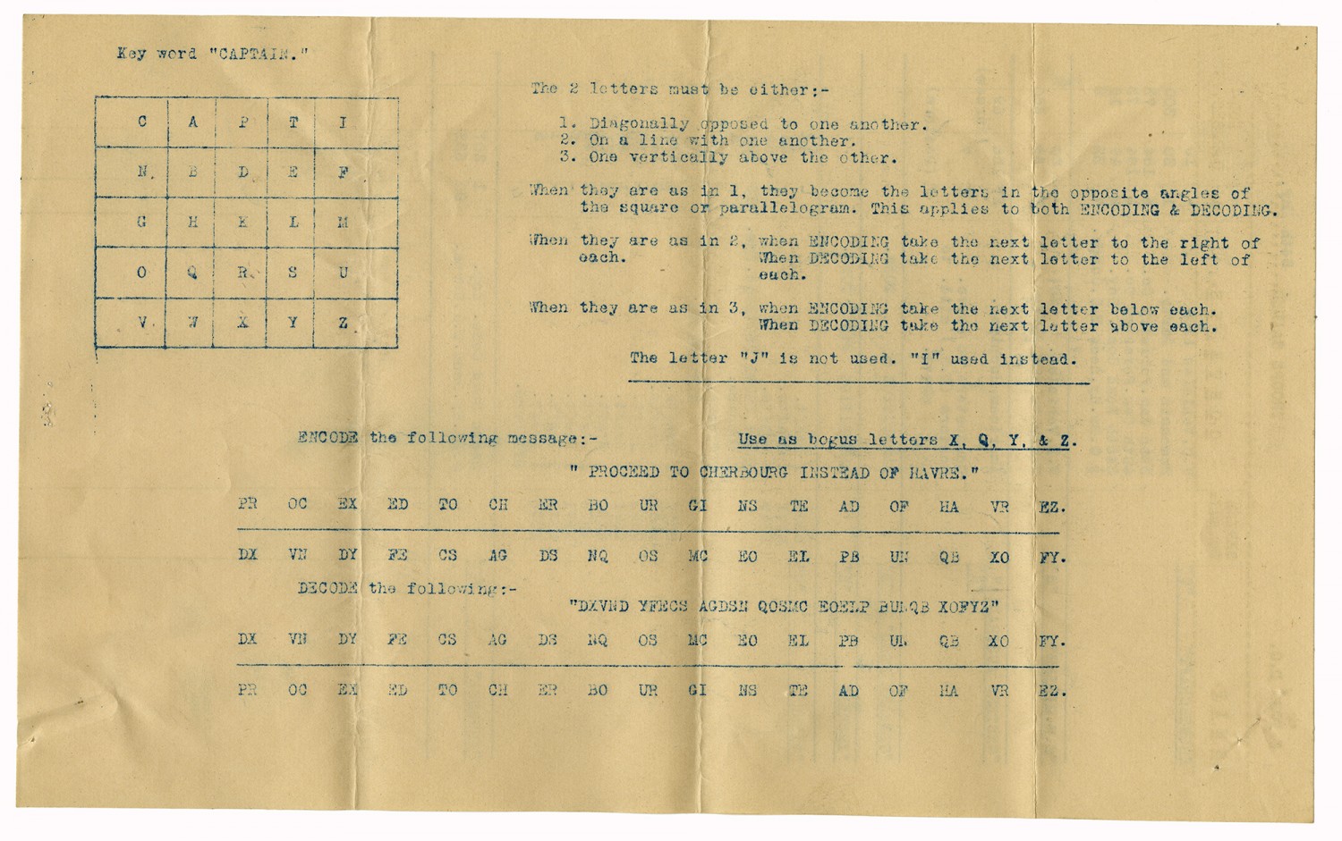 Key word "CAPTAIN." [chart] The 2 letters must be either:- 1. Diagonally opposed to one another. 2. On a line with one another. 3. One vertically above the other. When they are as in 1, they become the letters in the opposite angles of the square or parallelogram. This applies to both ENCODING & DECODING. When they are as in 2, when ENCODING take the next letter to the right of When DECODING take the next letter to the left of each. When they are as in 3, when ENCODING take the next letter below each. When DECODING take the next letter above each. The letter "J" is not used. "I" used instead. ENCODE the following message:- Use as bogus letters X, Q, Y, & Z. "PROCEED TO CHERBOURG INSTEAD OF HAVRE." PR OC EX ED TO CH ER BO UR GI NS TE AD OF HA VR EZ. DX VN DY FE CS AG DS NQ OS MC EO EL PB UN QB XO FY. DECODE the following:- DXVND YFECS AGDSN QOSMC EOELP BULQB XOFYZ" DX VN DY FE CS AG DS NQ OS MC EO EL PB UL QB XO FY. PR OC EX ED TO CH ER BO UR GI NS TE AD OF HA VR EZ.