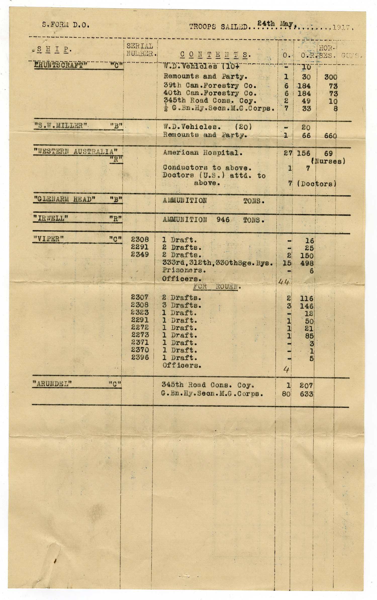 S. FORM D.O. TROOPS SAILED 24TH May, 1917, [SHIP] "HUNTSCRAFT" "C" [SERIAL NUMBER.] [CONTENTS.] W.D. Vehicles (10) Remounts and Party. 39th Can. Forestry Co. 40th Can. Forestry Co. 345th Road Cons. Coy.