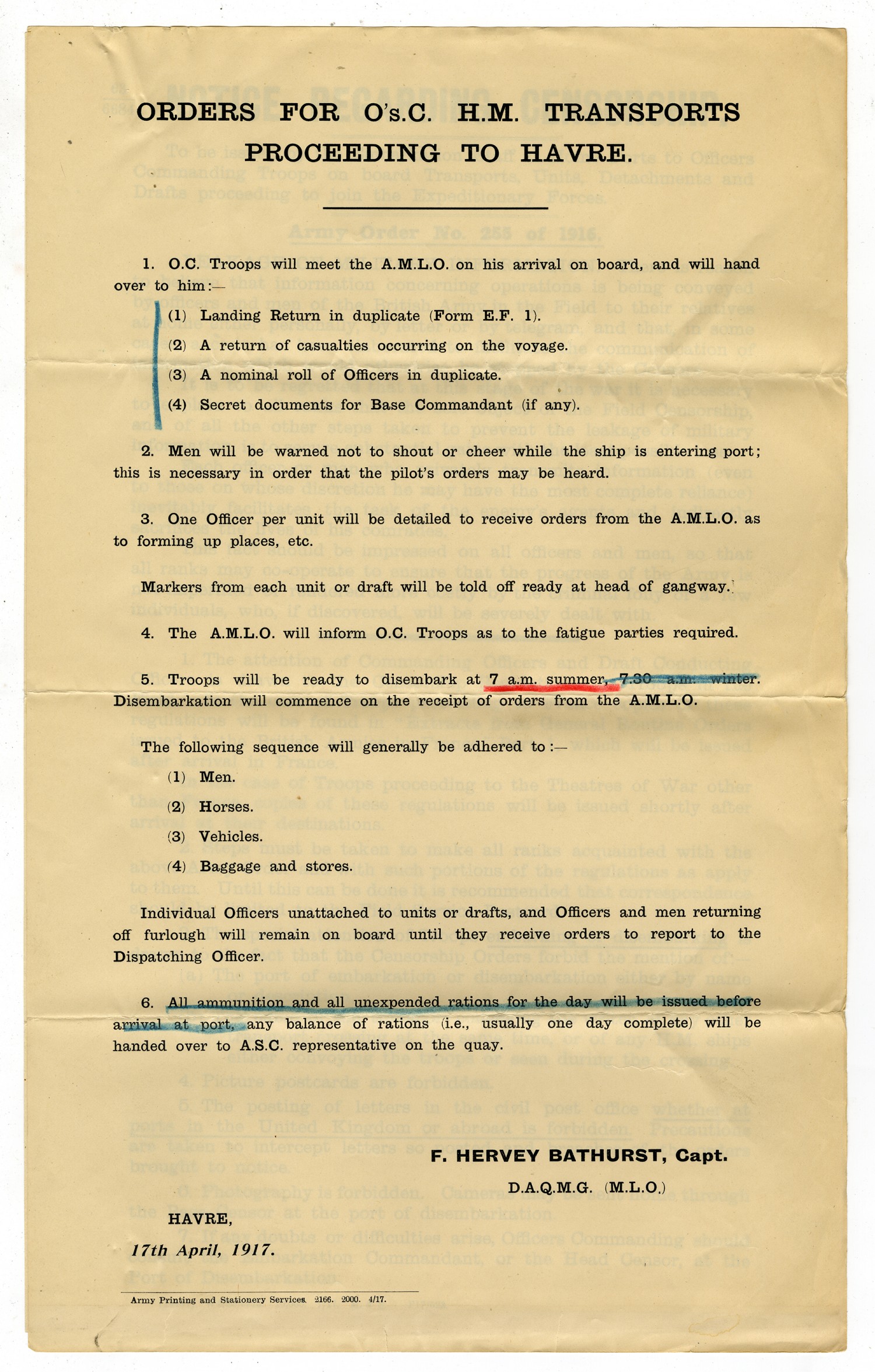 Orders For O's.C. H.M. Transports Proceeding To Havre. 1. O.C. Troops will meet the A.M.L.O on his arrival on board, and will hand over to him:- (1) Landing Return in duplicate (Form E.F. 1). (2) A return of casualties occurring on the voyage. (3) A nominal roll of Officers in duplicate (4) Secret documents for Base Commandant (if any). 2. Men will be warned not to shout or cheer while the ship is entering port; this is necessary in order that the pilot's order may be heard. 3. One Officer per unit will be detailed to receive orders from the A.M.L.O. as to forming up places, etc. Markers from each unit or draft will be told off ready at head of gangway. 4. The A.M.L.O. will inform O.C. Troops as to the fatigue parties required. 5. Troops will be ready to disembark at 7 a.m. summer, 7.30 a.m. winter. Disembarkation will commence on the receipt of orders from the A.M.L.O. The following sequence will generally be adhered to:- (1) Men. (2) Horses. (3) Vehicles. (4) Baggage and stores. Individual Officers unattached to units or drafts, and Officers and men returning off furlough will remain on board until they receive orders to report to the Dispatching Officer. 6. All ammunition and all unexpended rations for the day will be issued before arrival at port, any balance of rations (i.e.) usually one day complete will be handed over to A.S.C. representative on the quay. F. HERVEY BATHURST, Capt. D.A.Q.M.G. (M.L.O.) HAVRE, 17th April, 1917