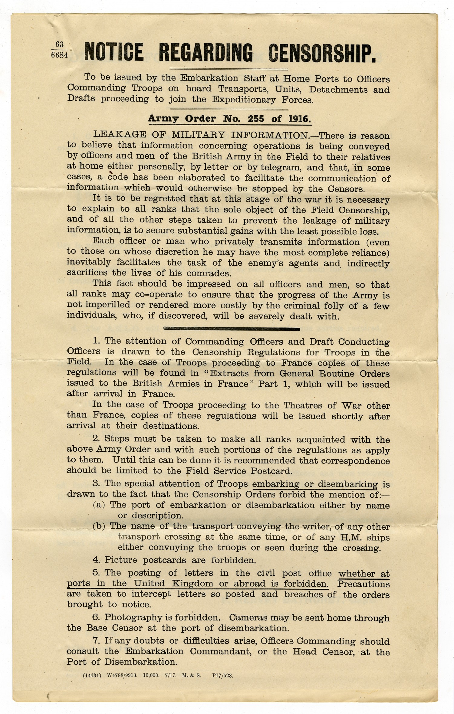 NOTICE REGARDING CENSORSHIP. To be issued by the Embarkation Staff at Home Ports to Officers Commanding Troops on board Transports, Units, Detachments and Drafts proceeding to join the Expeditionary Forces. Army Order No. 255 of 1916. LEAKAGE OF MILITARY INFORMATION.- There is reason to believe that information concerning operations is being conveyed by officers and men of the British Army in the Field to their relatives at home either personally, by letter or by telegram, and that, in some cases, a code has been elaborated to facilitate the communication of information which would otherwise be stopped by the Censors. It is to be regretted that at this stage of the war it is necessary to explain to all ranks that the sole object of the Field Censorship, and of all the other steps taken to prevent the leakage of military information, is to secure substantial gains with the least possible loss. Each officer or man who privately transmits information (even to those on whose discretion he may have the most complete reliance) inevitably facilitates the task of the enemy's agents and indirectly sacrifices the lives of his comrades. This fact should be impressed on all officers and men, so that all ranks may co-operate to ensure that the progress of the Army is not imperilled or rendered more costly by the criminal folly of a few individuals, who if discovered, will be severely dealt with. 1. The attention of Commanding Officers and Draft Conducting Officers is drawn to the Censorship Regulations for Troops in the Field. In the case of Troops proceeding to France copies of these regulations will be found in "Extracts from General Routine Orders issued to the British Armies in France" Part 1, which will be issued after arrival in France. In the case of Troops proceeding to the Theatres of War other than France, copies of these regulations will be issued shortly after arrival at their destinations. 2. Steps must be taken to make all ranks acquainted with the above Army Order and with such portions of the regulations as apply to them. Until this can be done it is recommended that correspondence should be limited to the Field Service Postcard. 3. The special attention of Troops embarking or disembarking is drawn to the fact that the Censorship Orders forbid the mention of:- (a) The port of embarkation or disembarkation either by name or description. (b) The name of the transport conveying the writer, or any other transport crossing at the same time, or of any H.M. ships either convoying the troops or seen during the crossing. 4. Picture postcards are forbidden. 5. The posting of letters in the civil post office whether at ports in the United Kingdom or abroad is forbidden. Precautions are taken to intercept letters so posted and breaches of the orders brought to notice. 6. Photography is forbidden. Cameras may be sent home through the Base Censor at the port of disembarkation. 7. If any doubts or difficulties arise, Officers Commanding should consult the Embarkation Commandant, or the Head Censor, at the Port of Disembarkation.