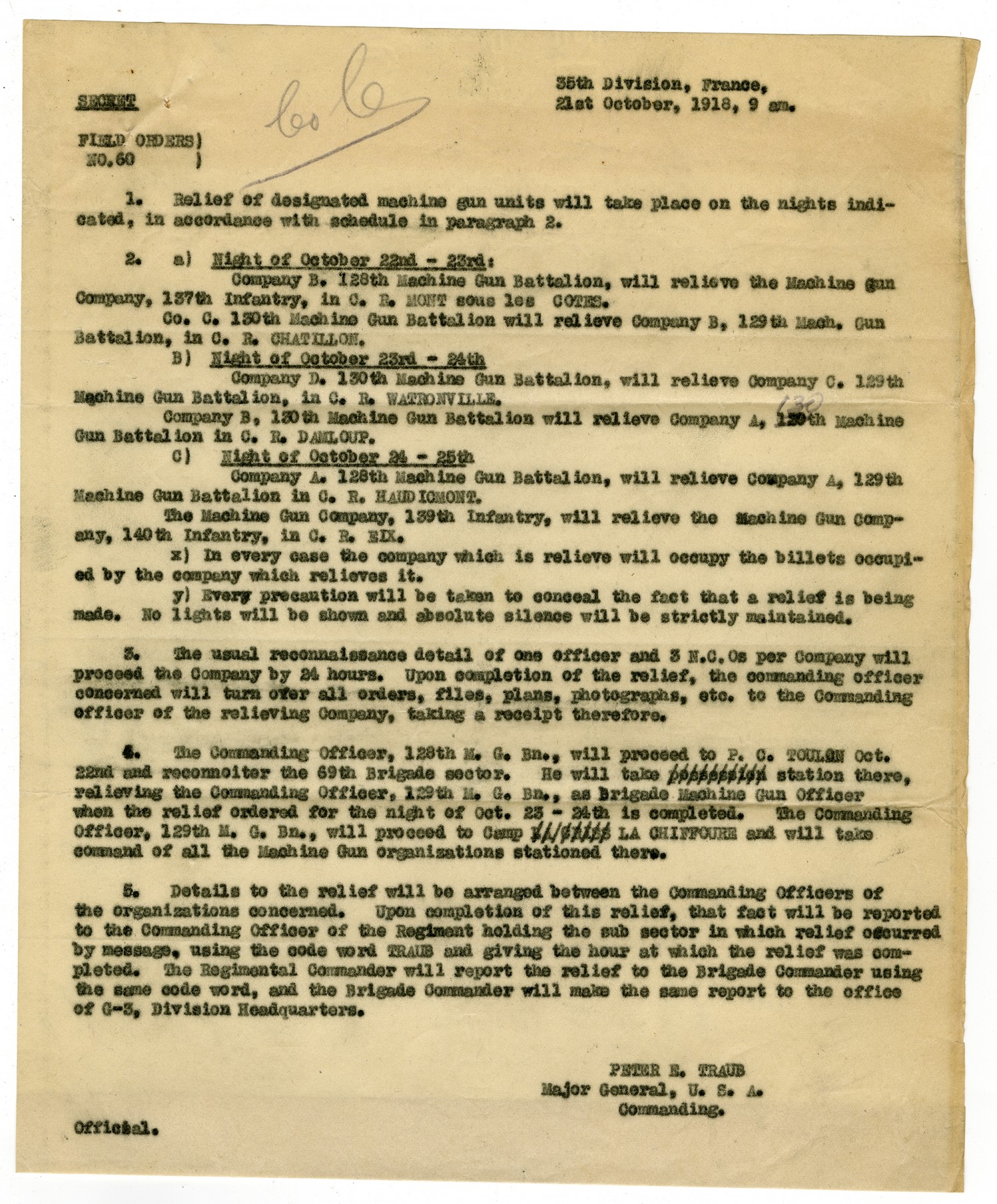 | Description | Field Orders number 60 from Major General Peter E. Traub to the 35th Division giving orders for movement of troops. Movement of the 128th, 129th, and 130th Machine Gun Battalions, and 137th, 139th and 140th Infantry are included. |