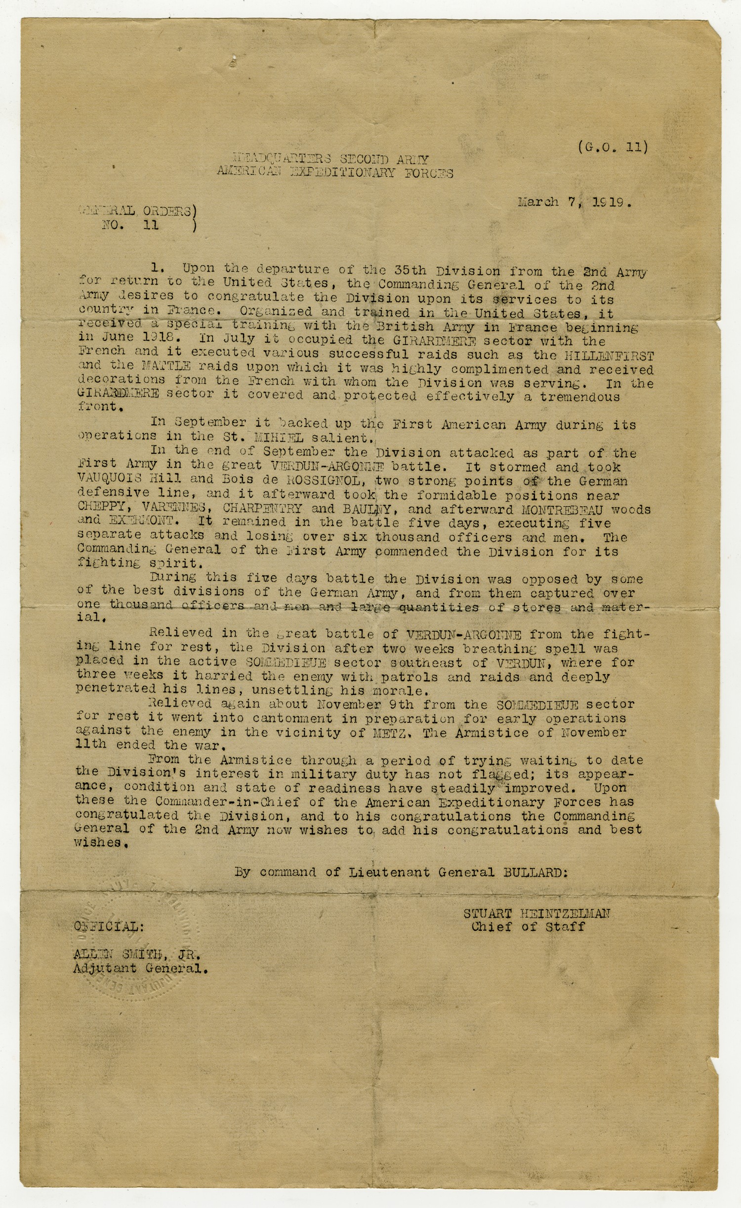 (G.O. 11) HEADQUARTERS SECOND ARMY AMERICAN EXPEDITIONAY FORCES March 7, 1919. GENERAL ORDERS NO. 11 ) 1. Upon the departure of the 35th Division from the 2nd Army for return to the United States, the Commanding General of the 2nd Army desires to congratulate the Division upon its services to its country in France. Organized and trained in the United States, it received a special training with the British Army in France beginning in June 1918. In July it occupied the GIRARDMERE sector with the French and it executed various successful raids such as the HILLENFIRST and the MATTLE raids upon which it was highly complimented and received decorations from the French with whom the Division was serving. In the GIRARDMERE sector it covered and protected effectively a tremendous front. In September it backed up the First American Army during its operations in the St. MIHIEL salient. In the end of September the Division attacked as part of the First Army in the great VERDUN-ARGONNE battle. It stormed and took VAUQUOIS Hill and Bois de ROSSIGNOL, two strong points of the German defensive line, and it afterward took the formidable positions near CHEPPY, VARENNES, CHARPENTRY and BAULNY, and afterwards MONTREBEAU woods and EXERMONT. It remained in the battle five days, executing five separate attacks and losing over six thousand officers and men. The Commanding General of the First Army commended the Division for its fighting spirit. During this five days battle the Division was opposed by some of the best divisions of the German Army, and from them captured over one thousand officers and men and large quantities of stores and material. Relieved in the great battle of VERDUN-ARGONNE from the fighting line for rest, the Division after two weeks breathing spell was placed in the active SOMMEDIEUE sector southwest of VERDUN, where for three weeks it harried the enemy with patrols and raids and deeply penetrated his lines, unsettling his morale. Relieved again about November 9th from the SOMMEDIEUE sector for rest it went into cantonment in preparation for early operations against the enemy in the vicinity of METZ. The Armistice of November 11th ended the war. From the Armistice through a period of trying waiting to date the Division