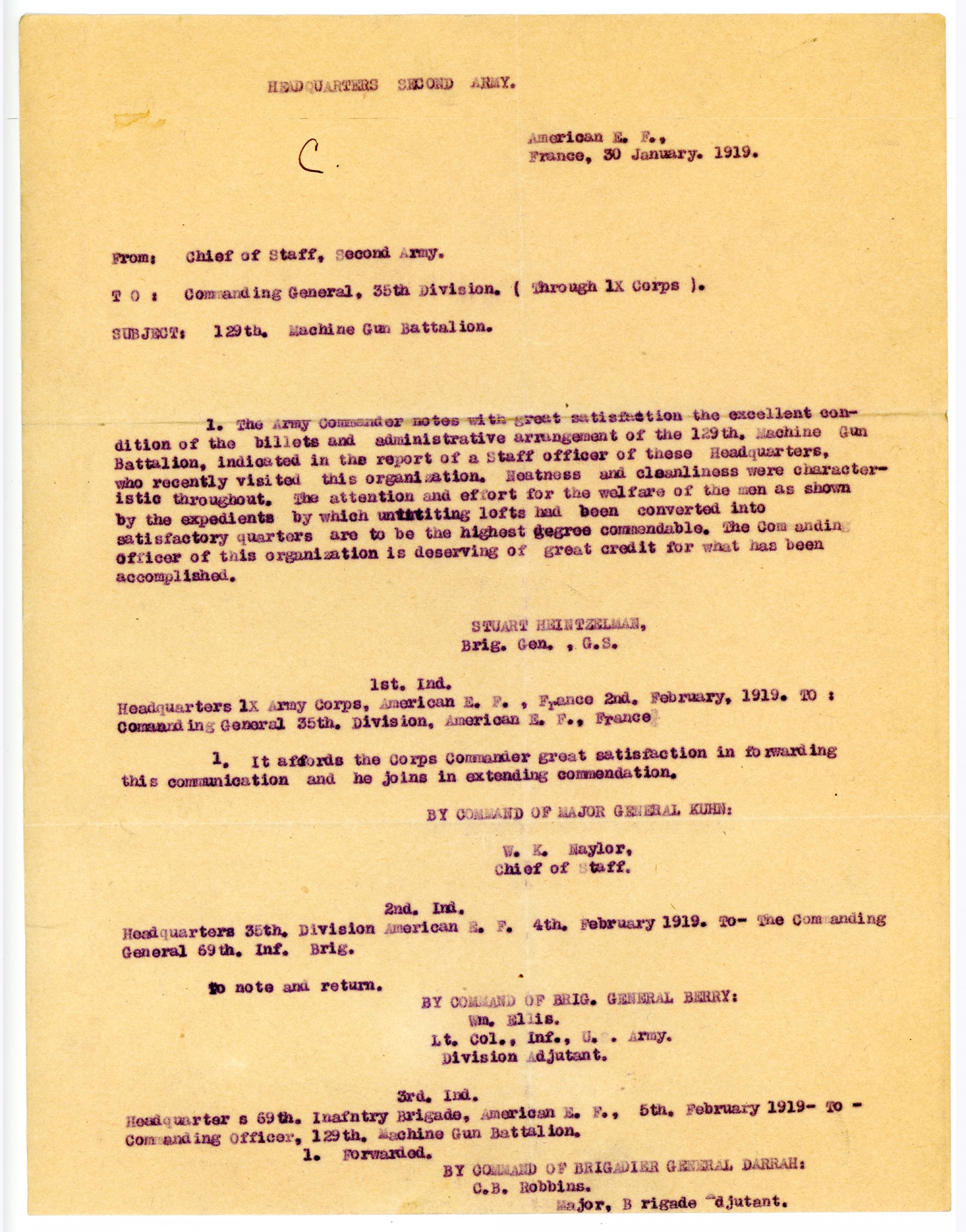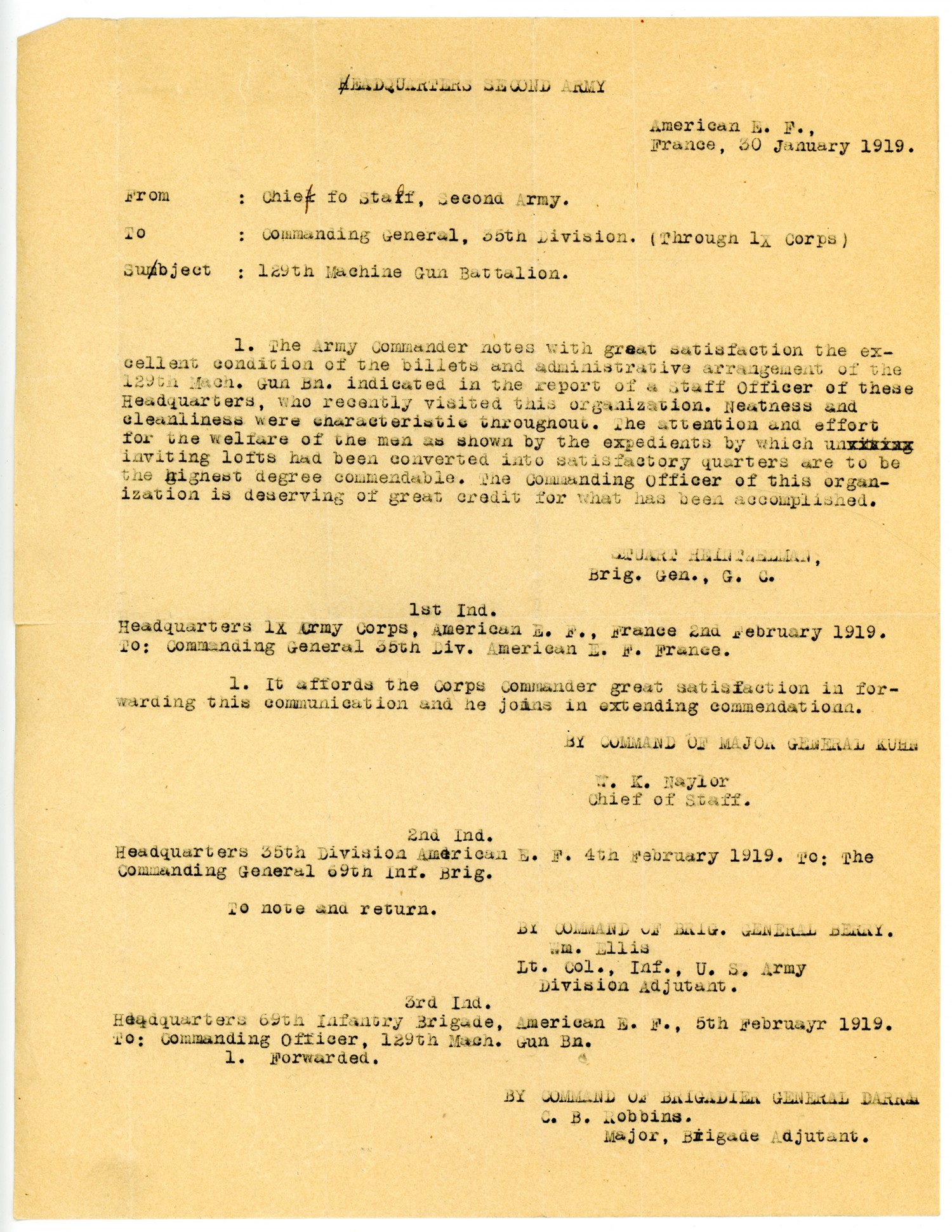 HEADQUARTERS SECOND ARMY American E. F. France, 30 January 1919. From Chief of Staff, Second Army. To: Commanding General, 35th Division. (Through 1x Corps) Subject: 129th Machine Gun Battalion. 1. The Army Commander notes with great satisfaction the excellent condition of the billets and administrative arrangement of the 129th Mach. Gun Bn. indicated in the report of a Staff Officer of these Headquarters, who recently visited this organization. Neatness and cleanliness were characteristic throughout. The attention and effort for the welfare of the men as shown by the expedients by which inviting lofts had been converted into satisfactory quarters are to be the highest degree commendable. The Commanding Officer of this organization is deserving of great credit for what has been accomplished. STUART HEINTZELMAN Brig. Gen., G. C. 1st Ind. Headquarters 1x Army Corps, American E. F., France 2nd February 1919. To: Commanding General 36th Div. American E. F. France. 1. It affords the Corps Commander great satisfaction in forwarding this communication and he joins in extending commendationn. BY COMMAND OF MAJOR GENERAL KUHN W. K. NAYLOR Chief of Staff. 2nd Ind. Headquarters 35th Division American E. F. 4th February 1919. To: The Commanding General 69th Inf. Brig. To note and return. BY COMMAND OF BRIG. GENERAL BERRY. Wm. Ellis Lt. Col., Inf., U.S. Army Division Adjutant. 3rd Ind. Headquarters 69th Infantry Brigade, American E. F. 5th [February] 1919. To: Commanding Officer, 129th Mach. Gun Bn. 1. Forwarded. BY COMMAND OF BRIGADIER GENERAL DARRAH C.B. Robbins. Major, Brigade Adjutant.