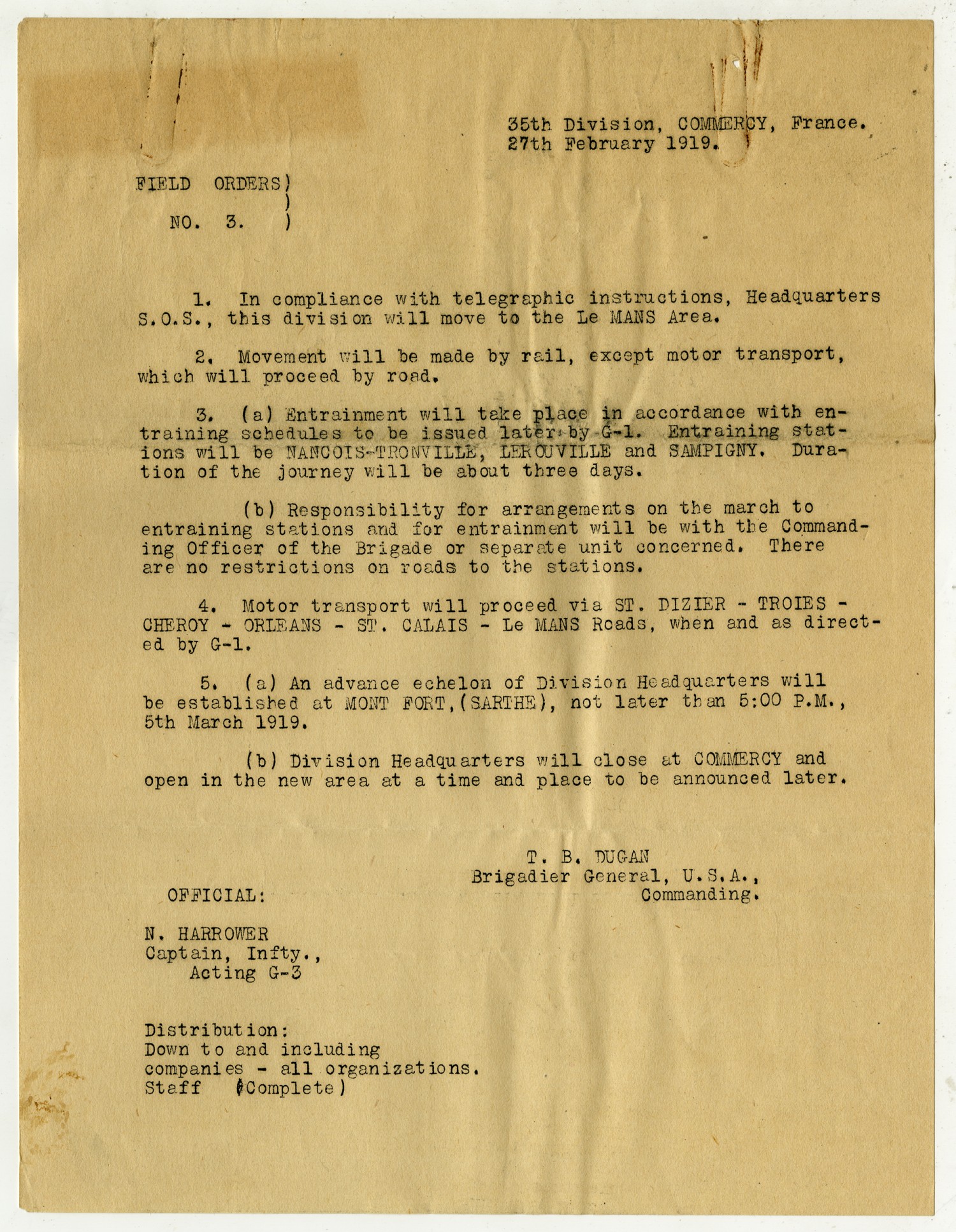| Description | Brigadier General T.B. Dugan issued these orders to move the 35th Division to the Le Mans area from Commercy, France. |