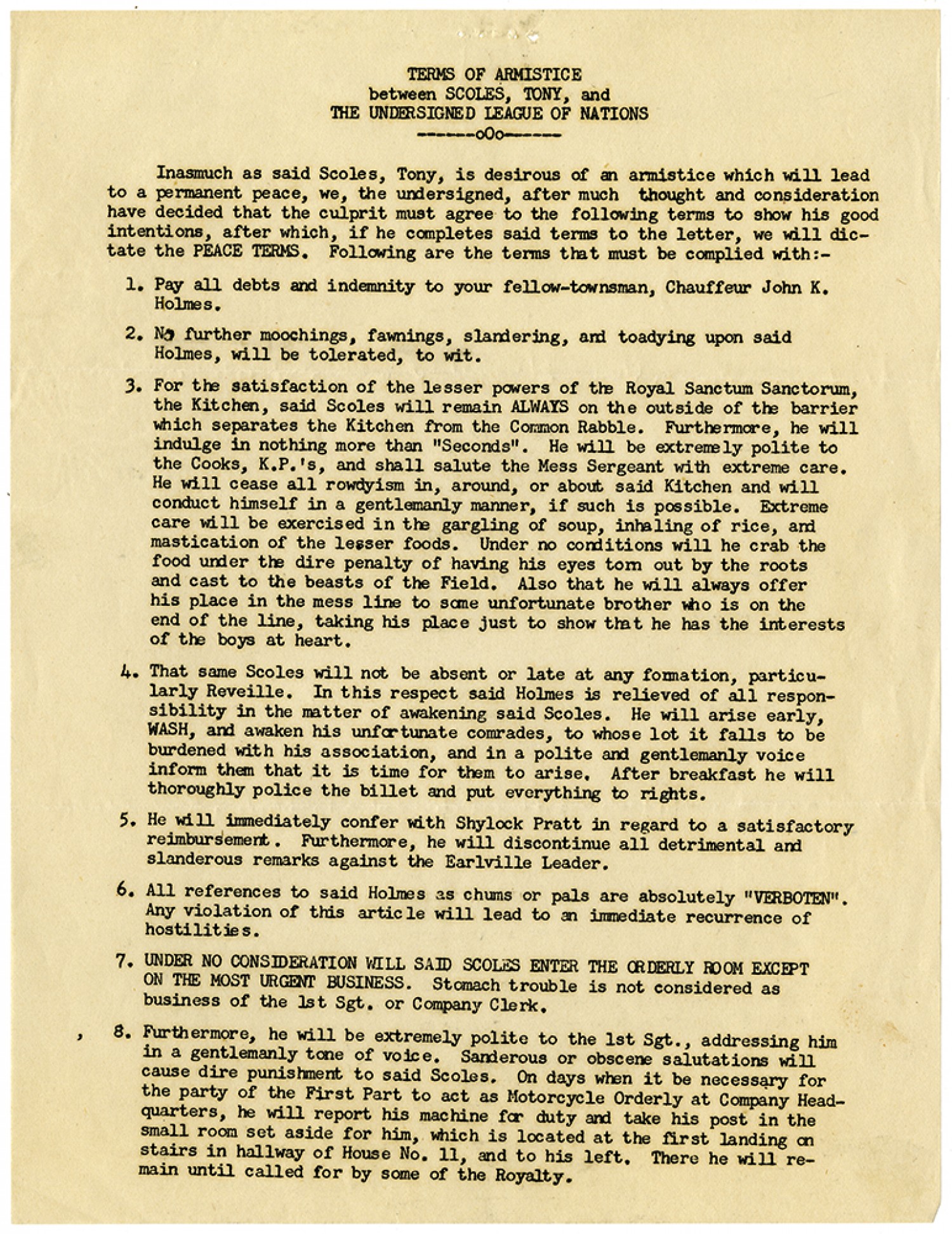 TERMS OF ARMISTICE between SCOLES, TONY, and THE UNDERSIGNED LEAGUE OF NATIONS Inasmuch as said Scoles, Tony, is desirous of an armistice which will lead to a permanent peace, we, the undersigned, after much thought and consideration have decided that the culprit must agree to the following terms to show his good intentions, after which, if he completes said terms to the letter, we will dictate the PEACE TERMS. Following are the terms that much be complied with:- 1. Pay all debts and indemnity to your fellow-townsman, Chauffeur John K. Holmes. 2. No further moochings, fawnings, slandering, and toadying upon said Holmes, will be tolerated, to wit. 3. For the satisfaction of the lesser powers of the Royal Sanctum Sanctorum, the Kitchen, said Scoles will remain ALWAYS on the outside of the barrier which separates the Kitchen from the Common Rabble. Furthermore, he will indulge in nothing more then "Seconds". He will be extremely polite to the Cooks, K.P.'s, and shall salute the Mess Sergeant with extreme care. He will cease all rowdyism in, around, or about said Kitchen and will conduct himself in a gentlemanly manner, if such is possible. Extreme care will be exercised in the gargling of soup, inhaling of rice, and mastication of the lesser foods. Under no conditions will he crab the food under the dire penalty of having his eyes torn out by the roots and cast in the mess line to some unfortunate brother who is on the end of the line, taking his place just to show that he has the interests of the boys at heart. 4. That same Scoles will not be absent or late at any formation, particularly Reveille. In this respect said Holmes is relieved of all responsibility in the matter of awakening said Scoles. He will arise early, WASH, and awaken his unfortunate comrades, to whose lot it falls to be burdened with his association, and in a polite and gentlemanly voice inform them that it is time for them to arise. After breakfast he will thoroughly police the billet and put everything to rights. 5. He will immediately confer with Shylock Pratt in regard to a satisfactory reimbursement. Furthermore, he will discontinue all detrimental and slanderous remarks against the Earlville Leader. 6. All references to said Holmes as chums or pals are absolutely "VERBOTEN". Any violation of this article will lead to an immediate recurrence of hostilities. 7. UNDER NO CONSIDERATION WILL SAID SCOLES ENTER THE ORDERLY ROOM EXCEPT ON THE MOST URGENT BUSINESS. Stomach trouble is not considered as business of the 1st Sgt. or Company Clerk. 8. Furthermore, he will be extremely polite to the 1st Sgt., addressing him in a gentlemanly tone of voice. Sanderous or obscene salutations will cause dire punishment to said Scoles. On days when it be necessary for the party of the First Part of act as Motorcycle Orderly at Company Headquarters, he will report his machine for duty and take his post in the small room set aside for him, which is located at the first landing on stairs in hallway of House No. 11, and to his left. There he will remain until called for by some of the Royalty.