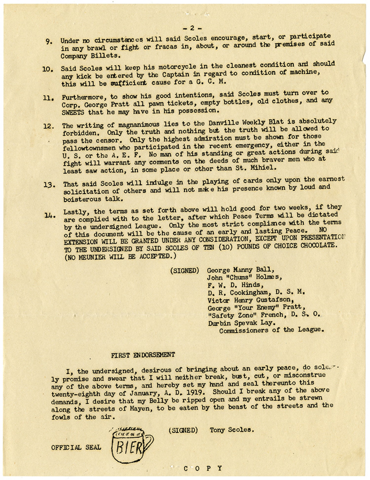 [page 2] 9. Under no circumstances will said Scoles encourage, start, or participate in any brawl or fight or fracas in, about, or around the premises of said Company Billets. 10. Said Scoles will keep his motorcycle in the cleanest condition and should any kick be entered by the Captain in regard to condition of machine, this will be sufficient cause for a G. C. M. 11. Furthermore, to show his good intentions, said Scoles must turn over to Corp. George Pratt all pawn tickets, empty bottles, old clothes, and any SWEETS that he may have in his possession. 12. The writing of magnanimous lies to the Danville Weekly Blat is absolutely forbidden. Only the turht and nothing but the truth will be allowed to pass the censor. Only the highest admiration must be shown for those fellowtownsmen who participated in the rent emergency, either in the U. S. or the A. E. F. No man of his standing or great actions during said fight will warrant any comments on the deeds of much braver men who at least saw action, in some place or other then St. Mihiel. 13. That said Scoles will indulge in the playing of cards only upon the earnest solicitation of others and will not make his presence known by loud and boisterous talk. 14. Lastly, the terms as set forth above will hold good for two weeks, if they are complied with to the letter, after which Peace Terms will be dictated by the undersigned League. Only the most strict compliance with the terms of this document will be the cause of an early and lasting Peace. NO EXTENSION WILL BE GRANTED UNDER ANY CONSIDERATION, EXCEPT PRESENTATION TO THE UNDERSTIGNED BY SAID SCOLES OF TEN (10) POUNDS OF CHOICE CHOCOLATE. (NO MEUNIER WILL BE ACCEPTED.) (SIGNED) George Manny Ball, John "Chums Holmes, F. W. D. Hinds, D.R. Cookingham, D. S. M. Victor Henry Gustafson, George "Your Enemy" Pratt, "Safety Zone" French, D. S. O. Durbin Spevak Lay. Commissioners of the League. FIRST ENDORSEMENT I, the undersigned, desirous of bringing about an early peace, so solemnly promise and swear that I will neither break, bust, cut, or misconstrue any of the above terms, and hereby set my hand and seal thereunto this twenty-eighth day of January, A. D. 1919. Should I break any of the above demands, I desire that my Belly be ripped open and my entrails be strewn along the streets of Mayen, to be eaten by the beast of the streets and the fowls of the airs. (SIGNED) Tony Scoles. Official Seal C O P Y
