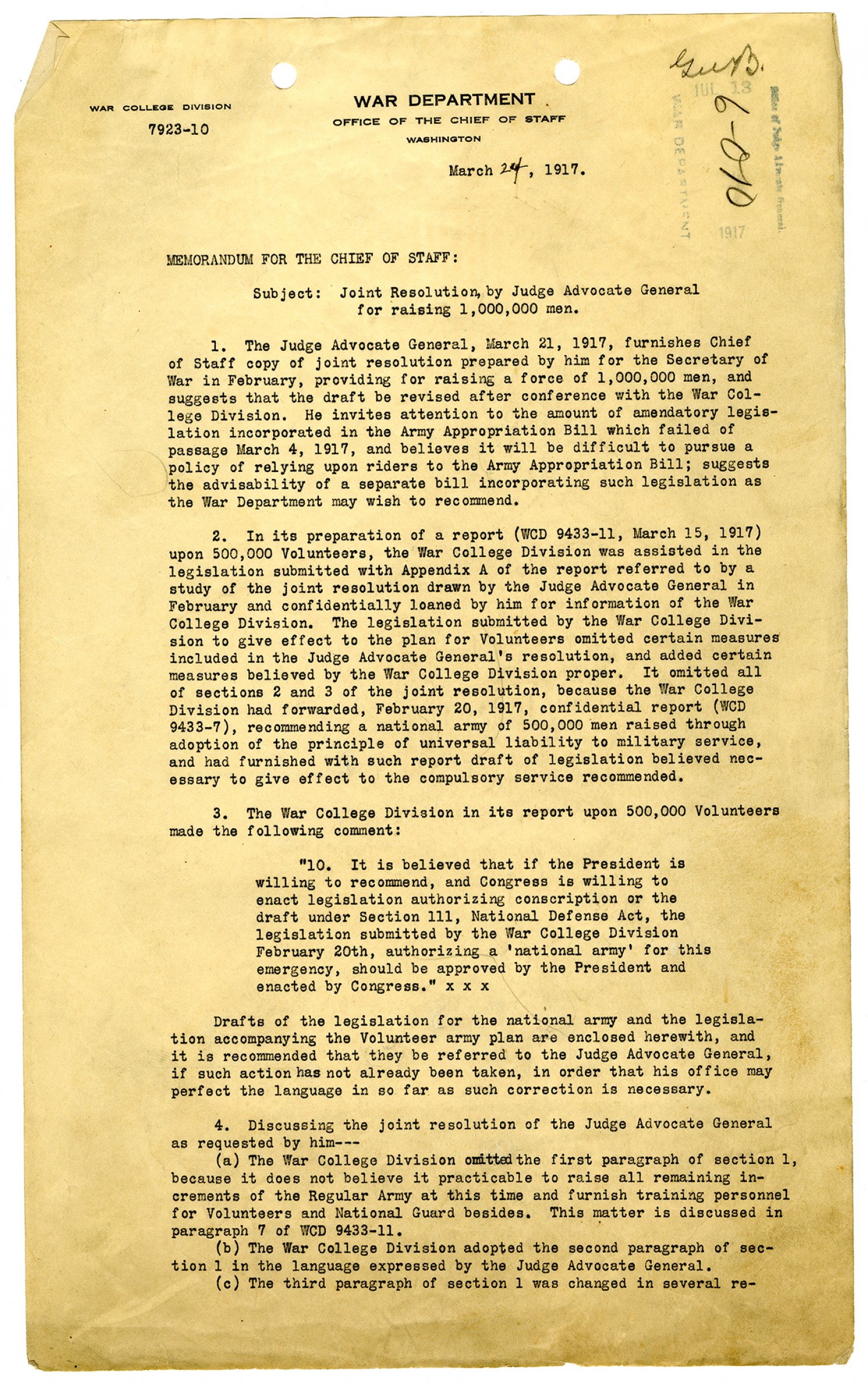 | Source | Kuhn, Joseph E. Joint Resolution by Judge Advocate General for Raising 1,000,000 Men. 24 March 1917. Crowder, Enoch H. (1859-1932), Papers, 1884-1942. C1046. The State Historical Society of Missouri, Columbia, MO. |