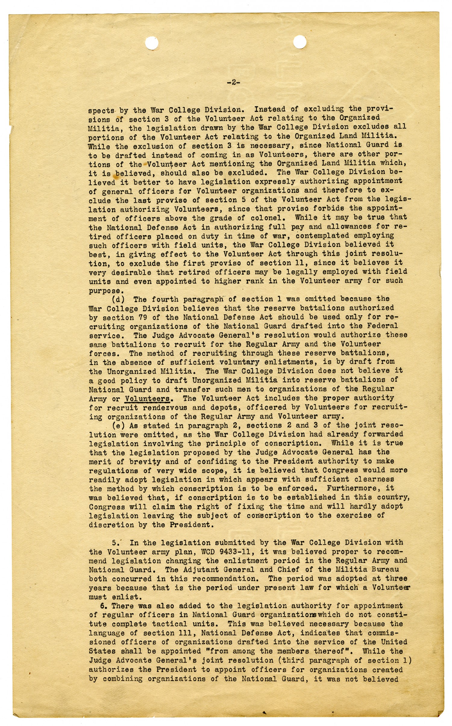[Page 2] spects by the War College Division. Instead of excluding the provisions of section 3 of the Volunteer Act relating to the Organized Militia, the legislation drawn by the War College Division excludes all portions of the Volunteer Act relating to the Organized Land Militia. While the exclusion of section 3 is necessary, since National Guard is to be drafted instead of coming in as Volunteers, there are other portions of the Volunteer Act mentioning the Organized Land Militia which, it is believed, should also be excluded. The War College Division believed it better to have legislation expressly authorizing appointment of general officers for Volunteer organizations and therefore to exclude the last proviso of section 5 of the Volunteer Act from the legislation authorizing Volunteers, since that proviso forbids that appointment of officers above the grade of colonel. While it may be true that the National Defense Act in authorizing full pay and allowances for retired officers placed on duty in time of war, contemplated employing such officers with field units, the War College Division believed it best, in giving effect to the Volunteer Act through this joint resolution, to exclude the first proviso of section 11, since it believes it very desirable that retired officers may be legally employed with field units and even appointed to higher rank in the Volunteer army for such purpose. (d) The fourth paragraph of section 1 was omitted because the War College Division believes that the reserve battalions authorized by section 79 of the National Defense Act should be used only for recruiting organizations of the National Guard drafted into the Federal service. The Judge Advocate General